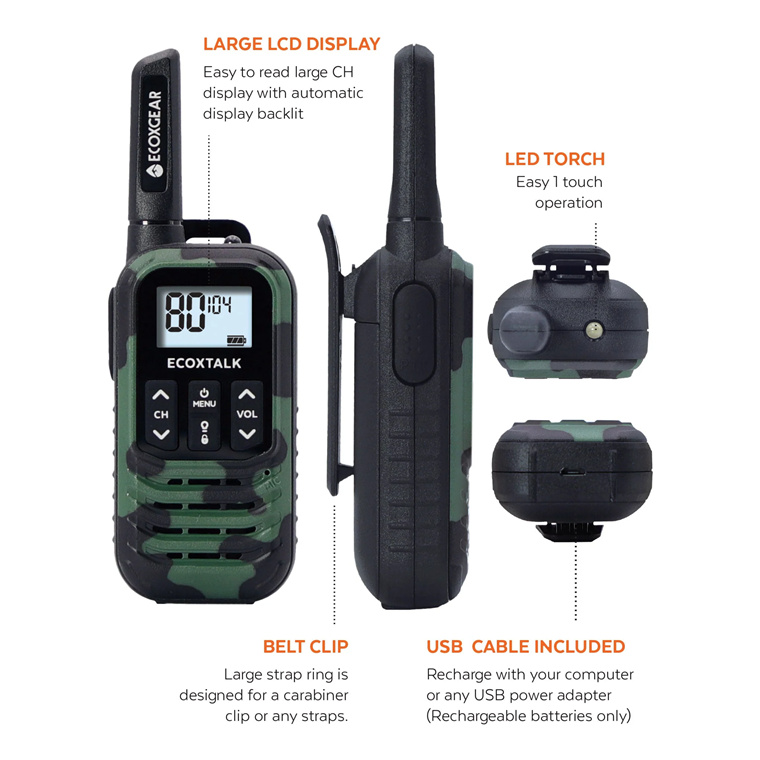 EXG50-2PKC (Camouflage Colour). Simple and easy-to-use by the entire family, the ECOXGEAR ECOXTALK EXG50 UHF CB Handheld Radios are perfect for staying in touch when you are outdoor: whether you're camping, hiking or at the park. EXG50 Radios have a range of up to 3KM and feature 80 channels (50 CTCSS codes & 104 DCS codes for uninterrupted communication).