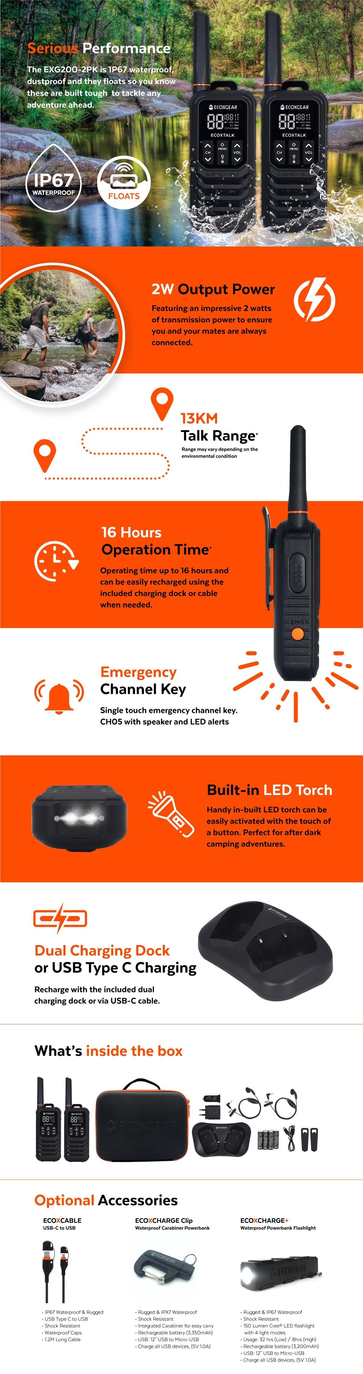 EXG200-2PK (Black Colour). Rugged, IP67 Waterproof & Dustproof design. ECOXGEAR ECOXTALK 2.0W Output Power EXG200 UHF CB Handheld radios are fully waterproof and float when dropped into water. The LED light will be activated automatically for easy retrieval. The Hands-free (VOX) Function keeps you connected without touching the unit. The best match for all your outdoor adventures. Camping, hiking, fishing, biking, kayaking, Paddleboard etc. A built-in LED Torch provides emergency light when needed. Low battery alert reminding you when batteries are low. With a range of up to 13Km, the EXG200 will keep you connected.