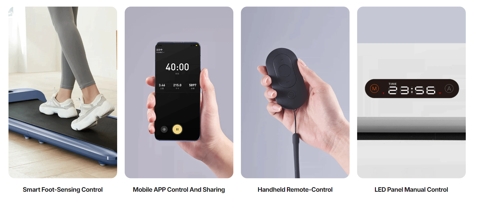 There are 4 options to control the treadmill. First, FootSense technology, display panel touch control, remote control or use the KS Fit app. Walk or Jog up to 3.7 mph at the touch of a button.