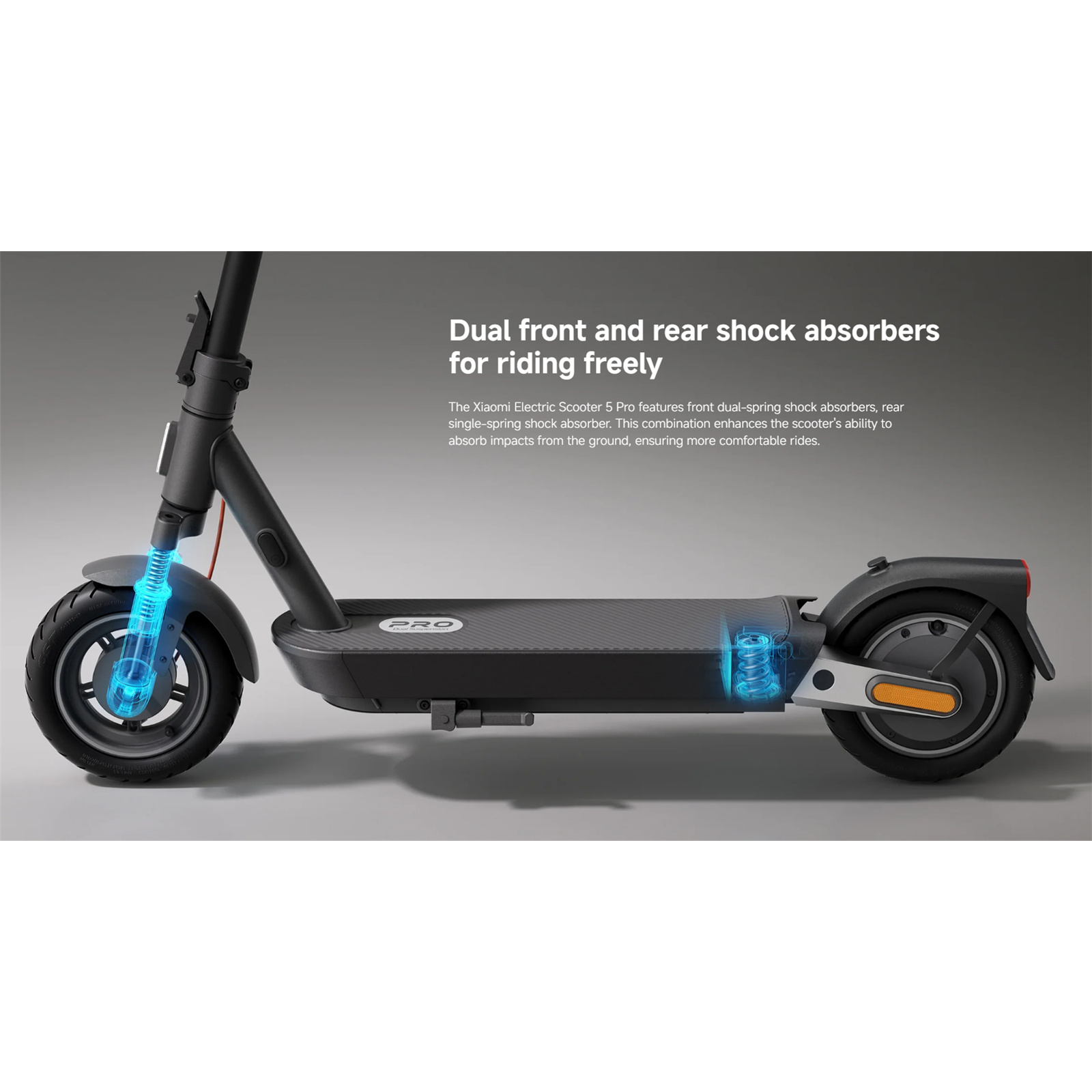 The Xiaomi Electric Scooter 5 Pro features front dual-spring shock absorbers, rear single-spring shock absorber. This combination enhances the scooter's ability to absorb impacts from the ground, ensuring more comfortable rides.