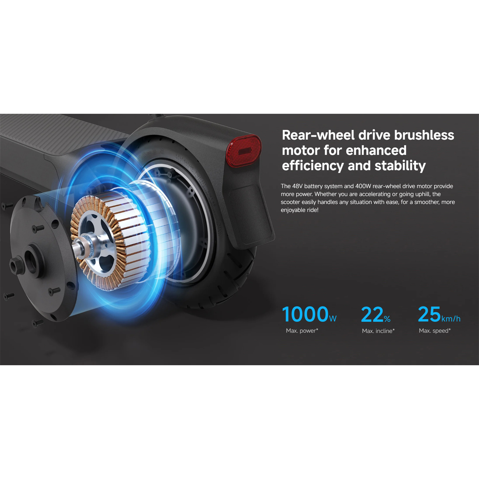 The 48V battery system and 400W rear-wheel drive motor provide more power. Whether you are accelerating or going uphill, the scooter easily handles any situation with ease, for a smoother, more enjoyable ride!