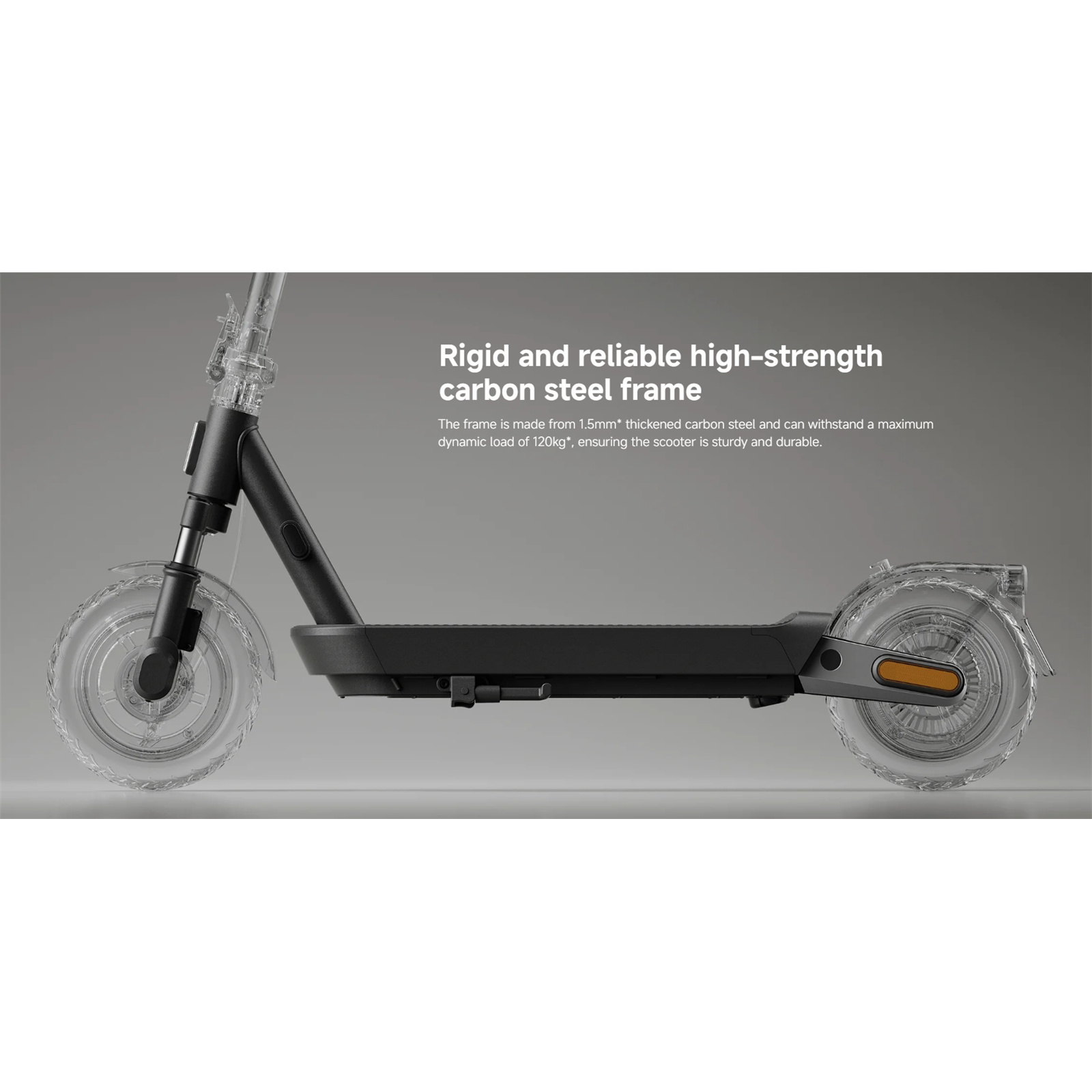 The frame is made from 1.5mm* thickened carbon steel and can withstand a maximum dynamic load of 120kg*, ensuring the scooter is sturdy and durable.