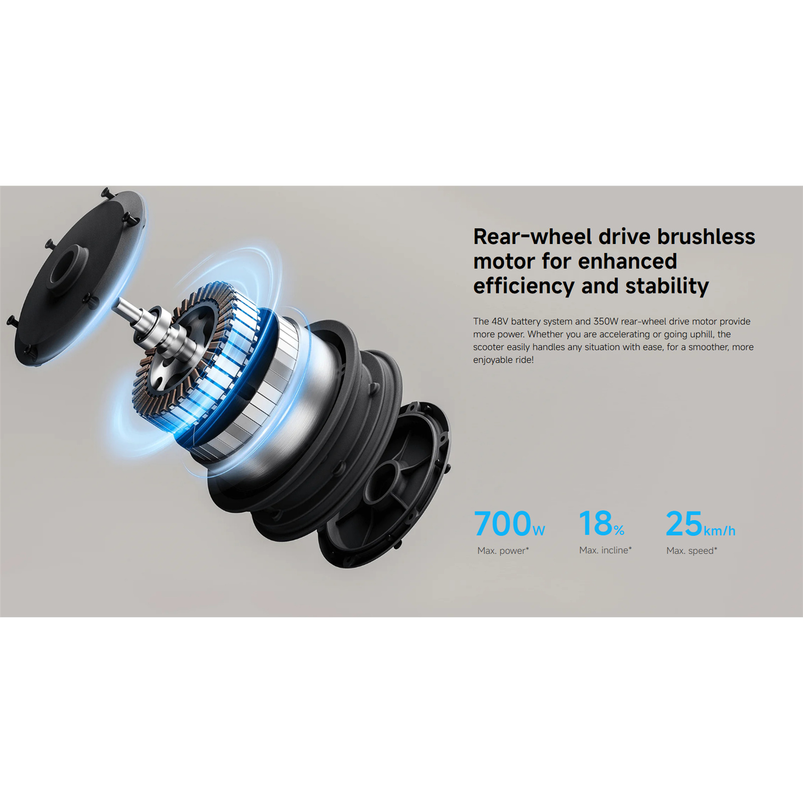 The 48V battery system and 350W rear-wheel drive motor provide more power. Whether you are accelerating or going uphill, the scooter easily handles any situation with ease, for a smoother, more enjoyable ride!