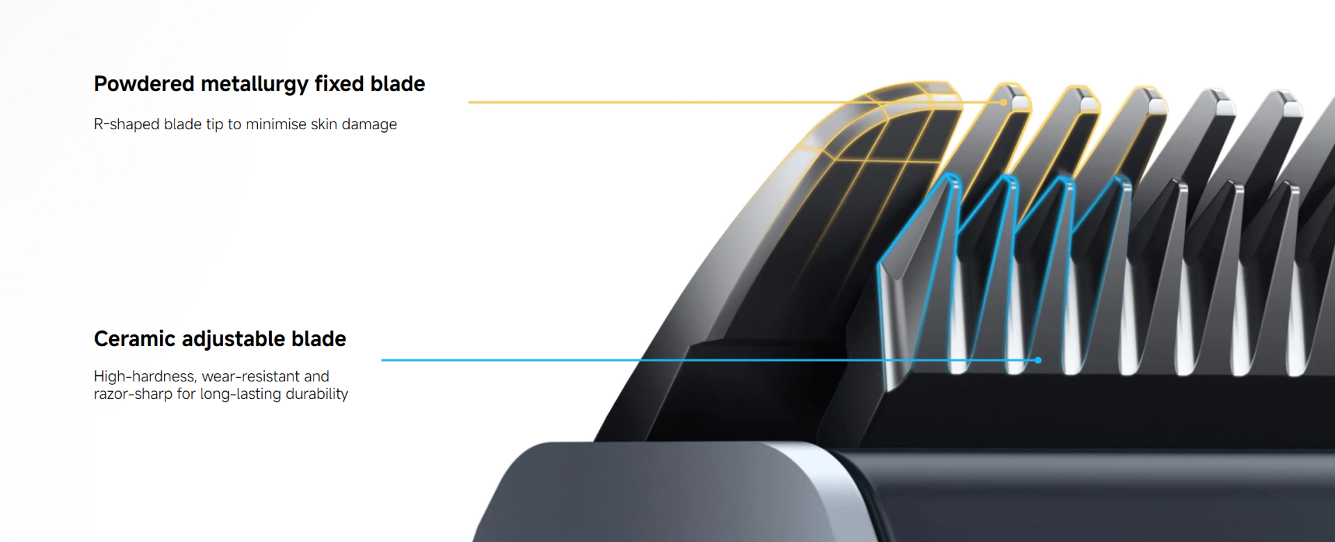 The fixed blade is crafted using powdered metallurgy and features a dual coating of vacuum DLC and graphene for increased durability. This effectively reduces scalp discomfort from heat caused by friction.