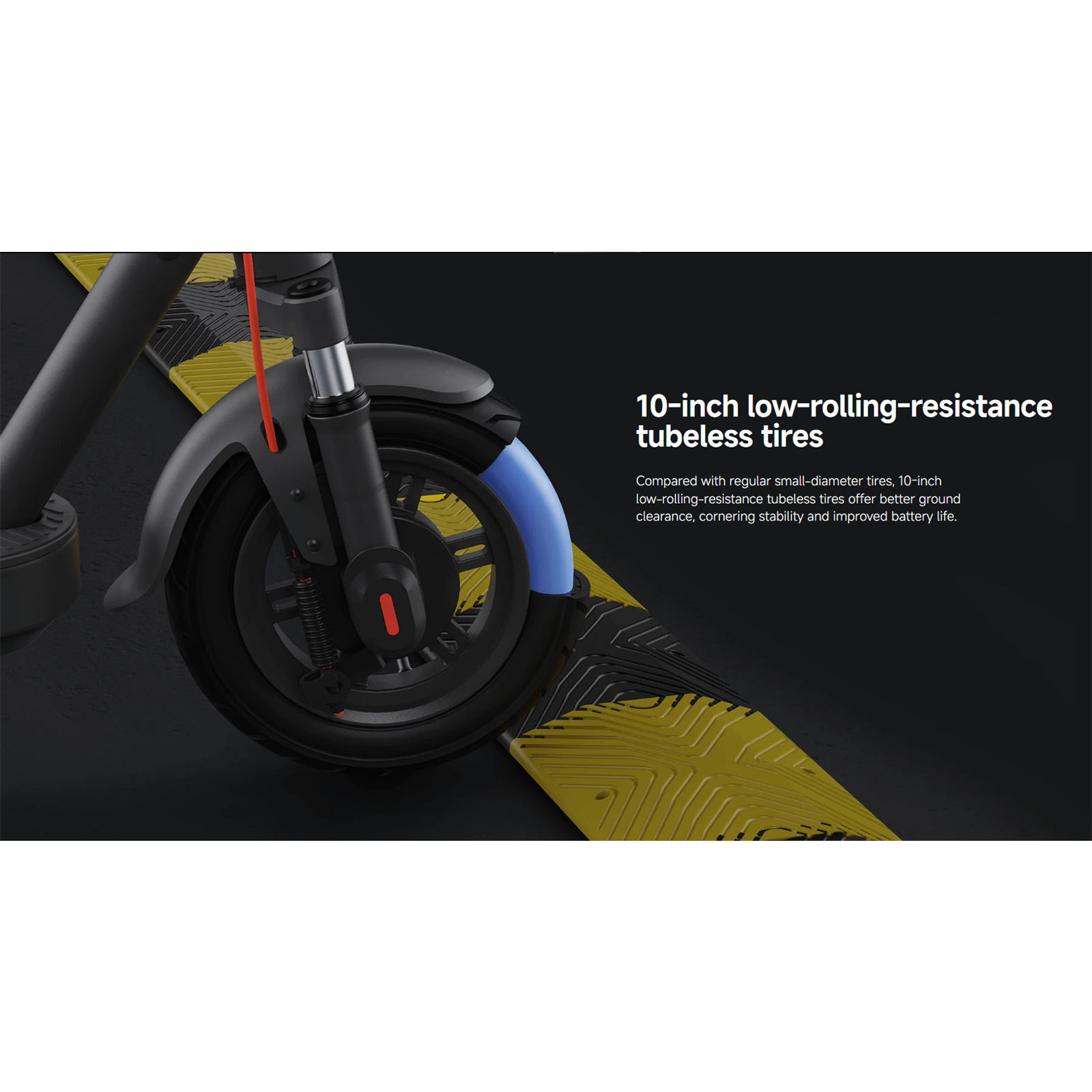 Compared with regular small-diameter tires, 10-inch low-rolling-resistance tubeless tires offer better ground clearance, cornering stability and improved battery life.