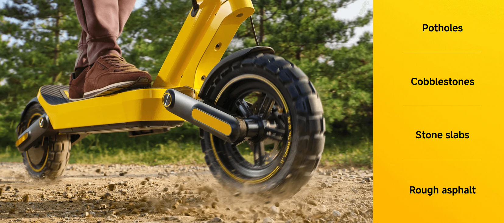Equipped with 3" wide low rolling-resistance all-terrain tires with a 12" outer diameter, the scooter glides smoothly over a variety of challenging surfaces.