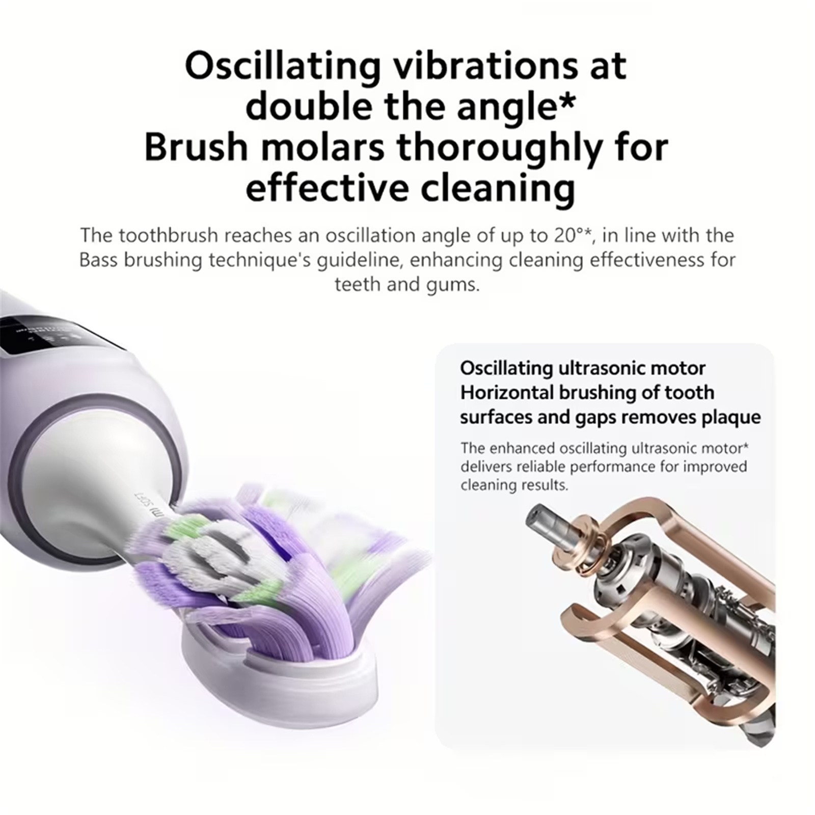 The toothbrush reaches an oscillation angle of up to 20°*, in line with the Bass brushing technique's guideline, enhancing cleaning effectiveness for teeth and gums.