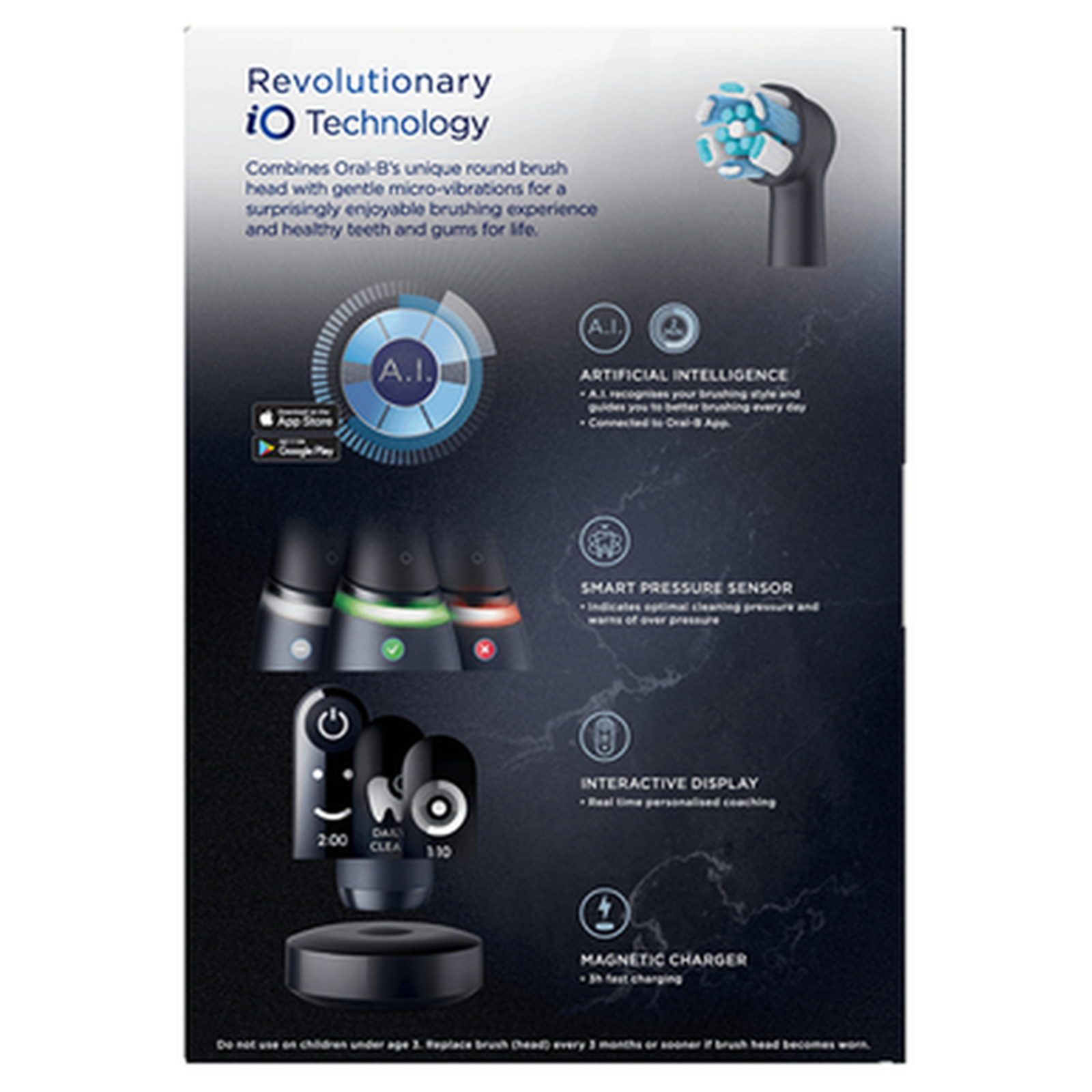 The Oral B io series rechargeable toothbrush combines powerful, but gentle micro-vibrations with Oral B unique dentist-inspired round brush head design for a professional clean feeling every day. The smart pressure sensor helps to keep you from brushing too hard to protect your gums and enamel. Ai recognition using an interactive display helps guide you to your best clean for all areas of the mouth. A 2-minute quadrant timer comes built-in that pulsates every 30 seconds, ensuring a complete clean. The frictionless, smooth magnetic drive system transfers energy to the bristle tips for a clean that wows. Replace your Oral B io series replacement brush heads every 3 months For best results.