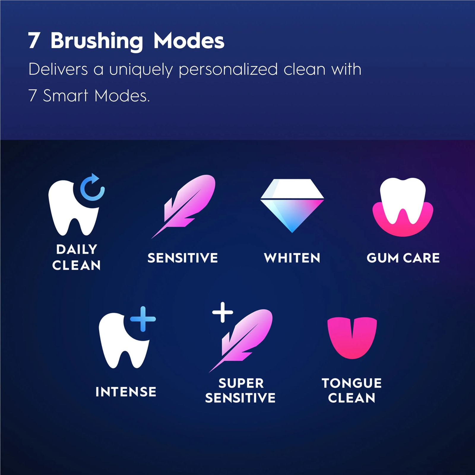 Features 7 Smart Brushing Settings including Daily Clean, Sensitive, Gum Care, Intense Clean, Super Sensitive, Tongue Clean, and Whiten.