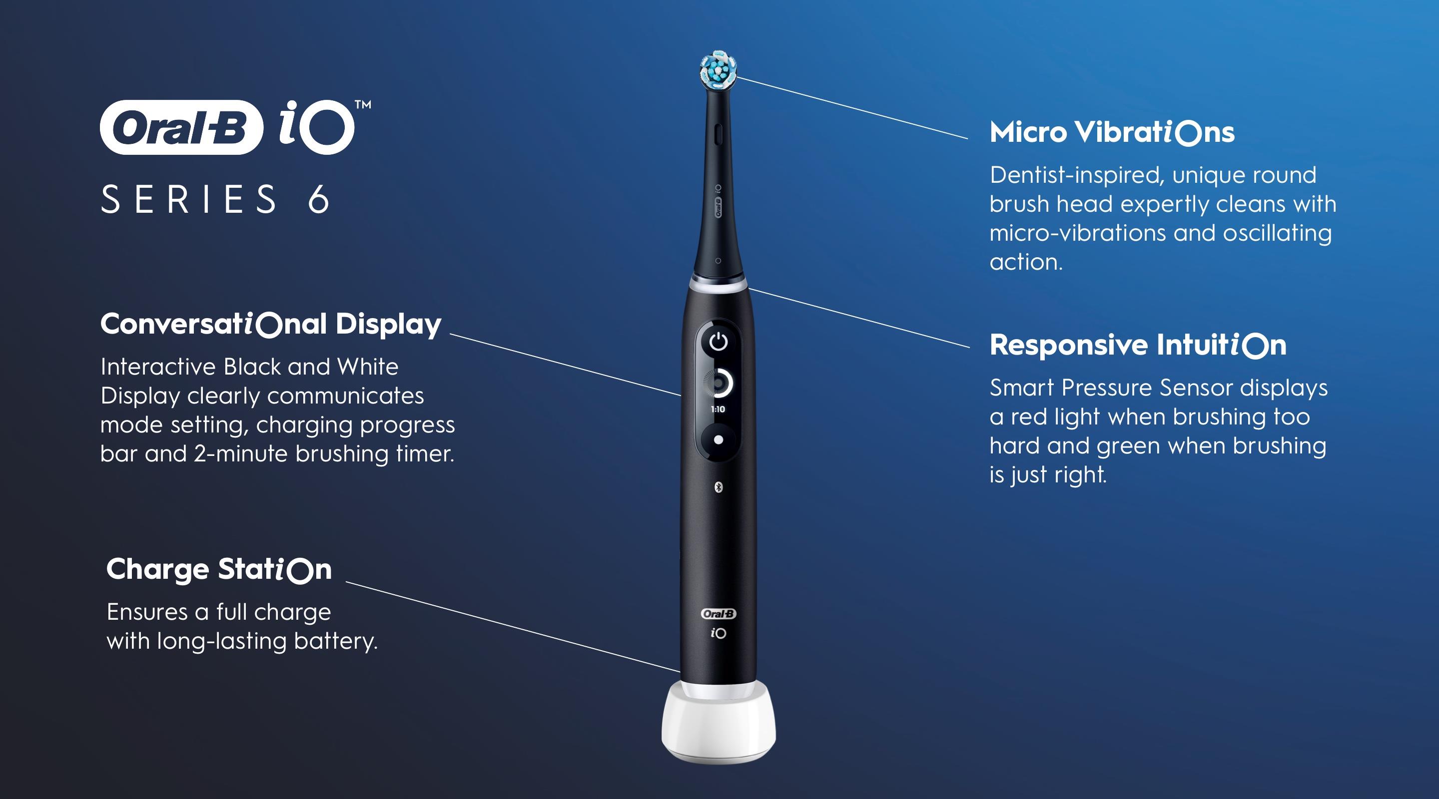 Experience a clean so advanced you'll feel like you just left the dentist. Advanced IO Technology helps track and Improve your brushing habits. The Oral-B 1O Serles 6 Electric Toothbrush combines powerful, but gentle micro-vibrations with Oral-B's dentist-inspired round brush head for a professional purifying clean every day. Advanced 1O Technology delivers 100% cleaner teeth and healthler gums in just 1 week versus a regular manual toothbrush.
