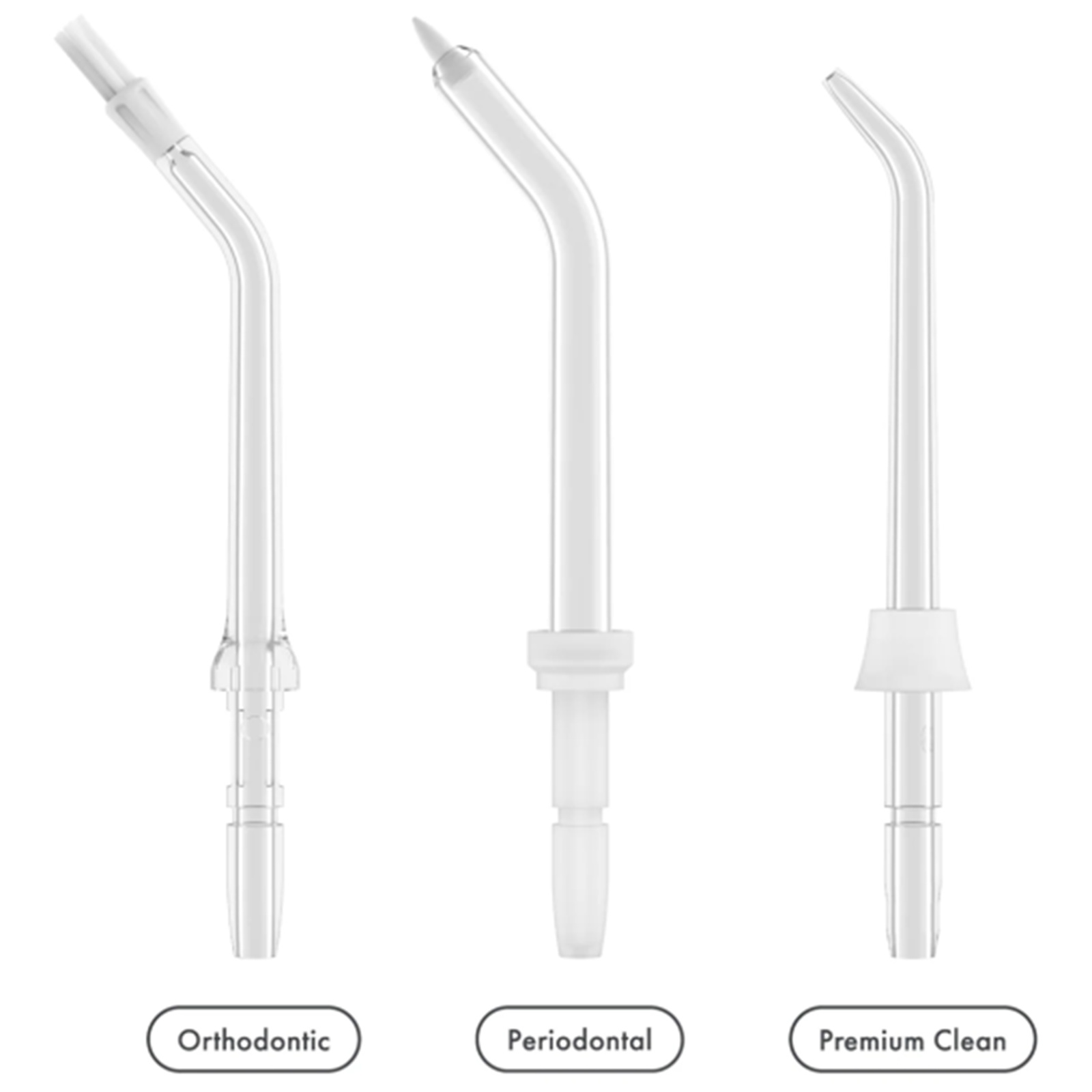 This pack contains 3 floss tips: 1 Orthodontic Tip, 1 Periodontal Tip, 1 Premium Clean Tip.
