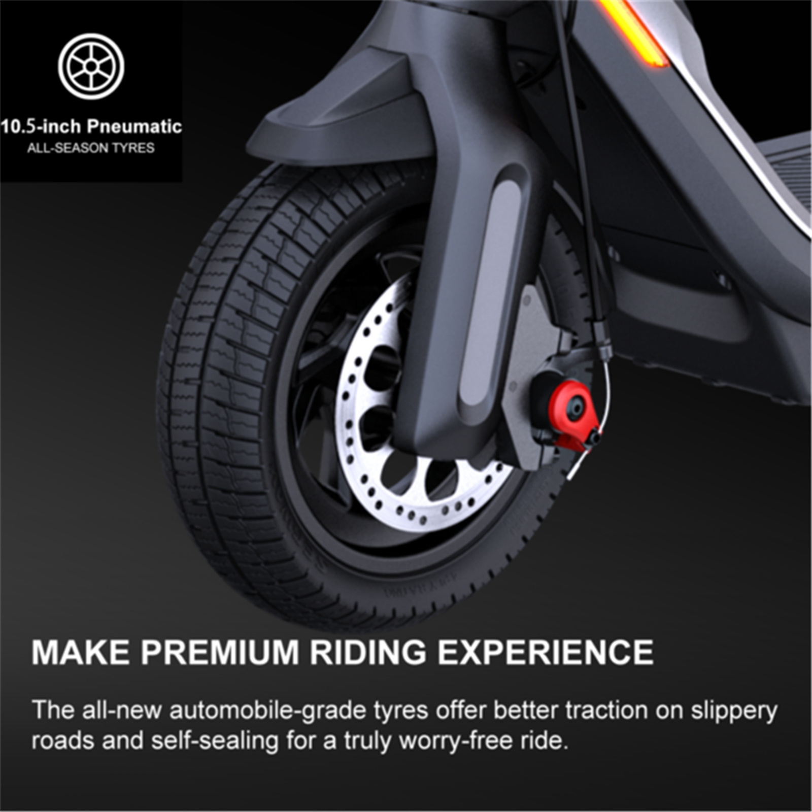 The P65D KickScooter is equipped with a double-piston disc brake for the front wheel and an electronic brake for the rear wheel, allowing you to brake more smoothly and safely.