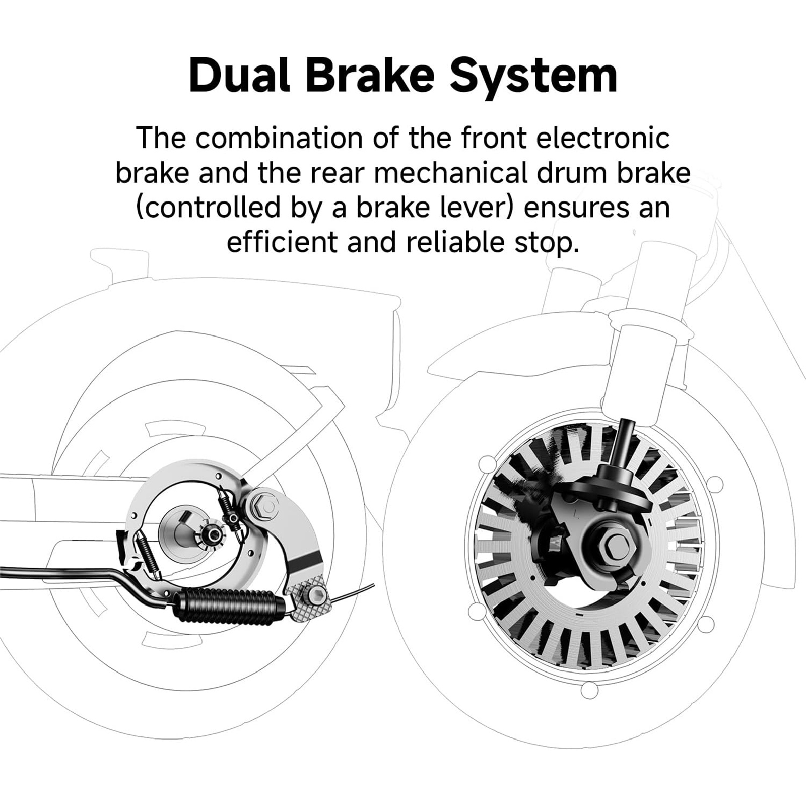 The combination of the front electric brake and the rear mechanical drum brake (controlled by a lever) ensures effective and reliable braking.
