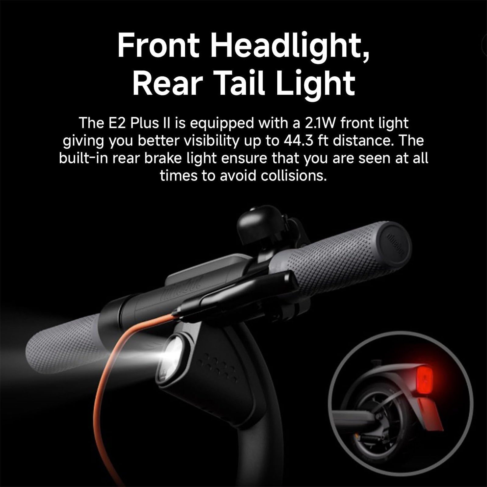 The E2 Plus E II is designed with a 2.1W front light, bringing you better dark visibility to up to 13.5-meter distance. The built-in direction indicators and rear brake light make sure you are noticeable to avoid collisions.
