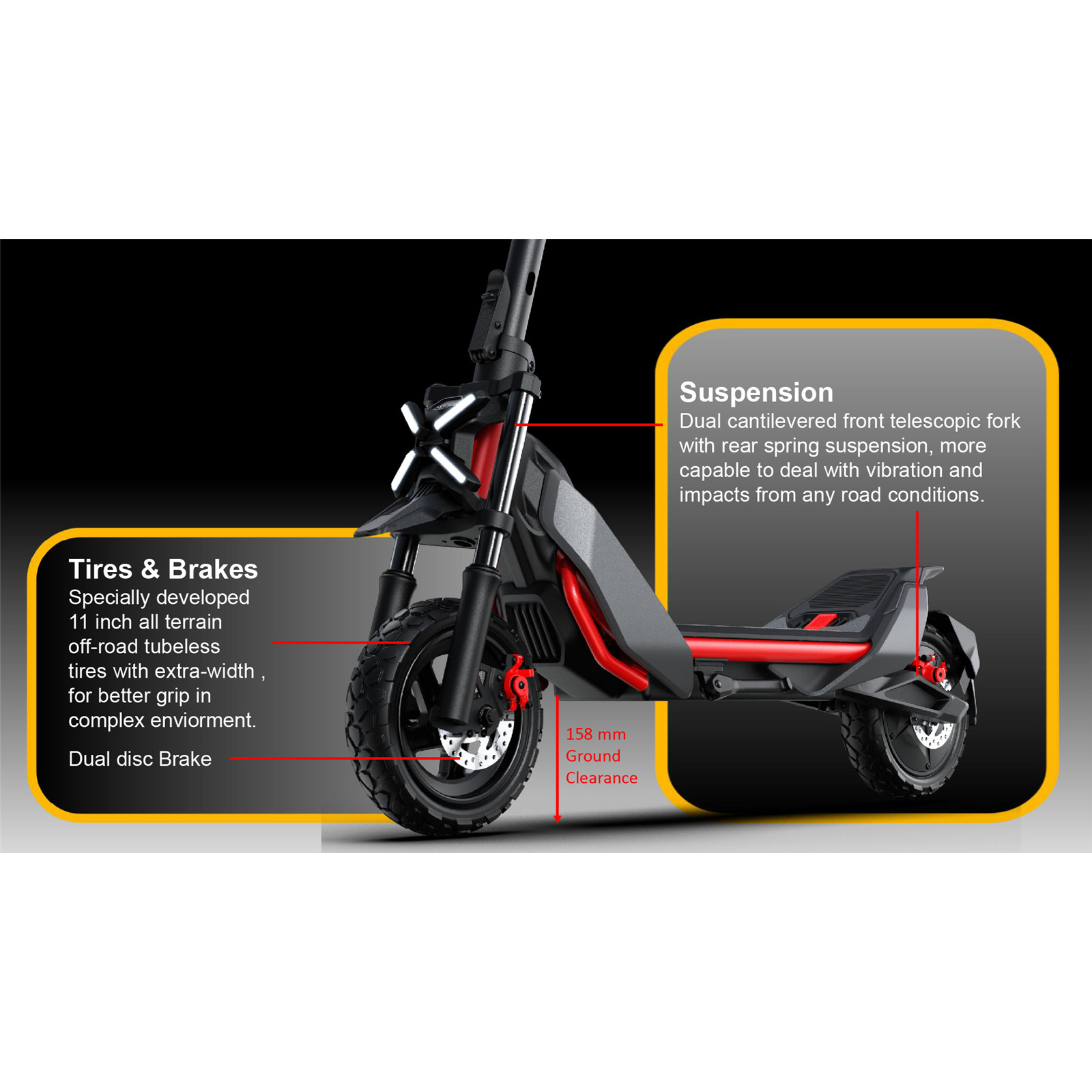 Specially crafted 11-inch off-road Tyres with tubeless interior, providing excellent support and 10% increased grip, making every landing comfortable and with confidence.