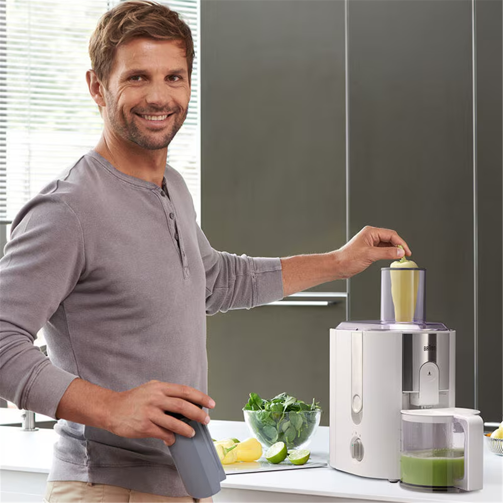 Enjoy your early-morning vitamin boost quickly and easily with the high-performance juicing system from Braun. It only takes seconds, with no cutting necessary thanks to the convenient large feeder chute, which allows you to toss in whole fruits and large chunks. The combination of foam separator and stainless steel micro-mesh sieve removes any foam and pulp, ensuring a very easy separation of foam and juice during the pouring.
