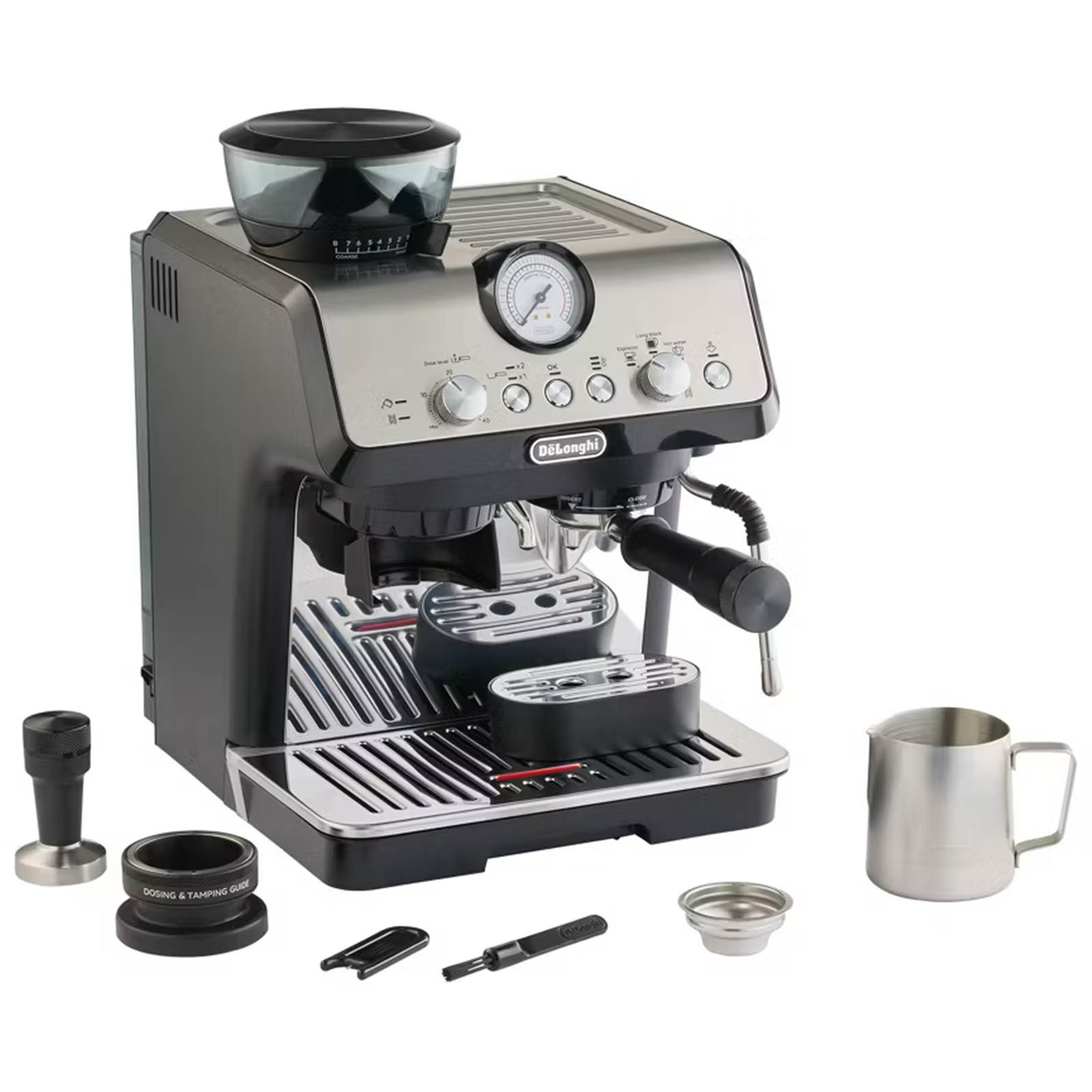 Delonghi Espresso and Cappuccino Maker with Grinder 3 Infusion coffee Tempreatures: 92, 94 or 96°C, Thermoblock Heating, 8 grinder Settings, 1.5L Water tank, 15 bar Pump