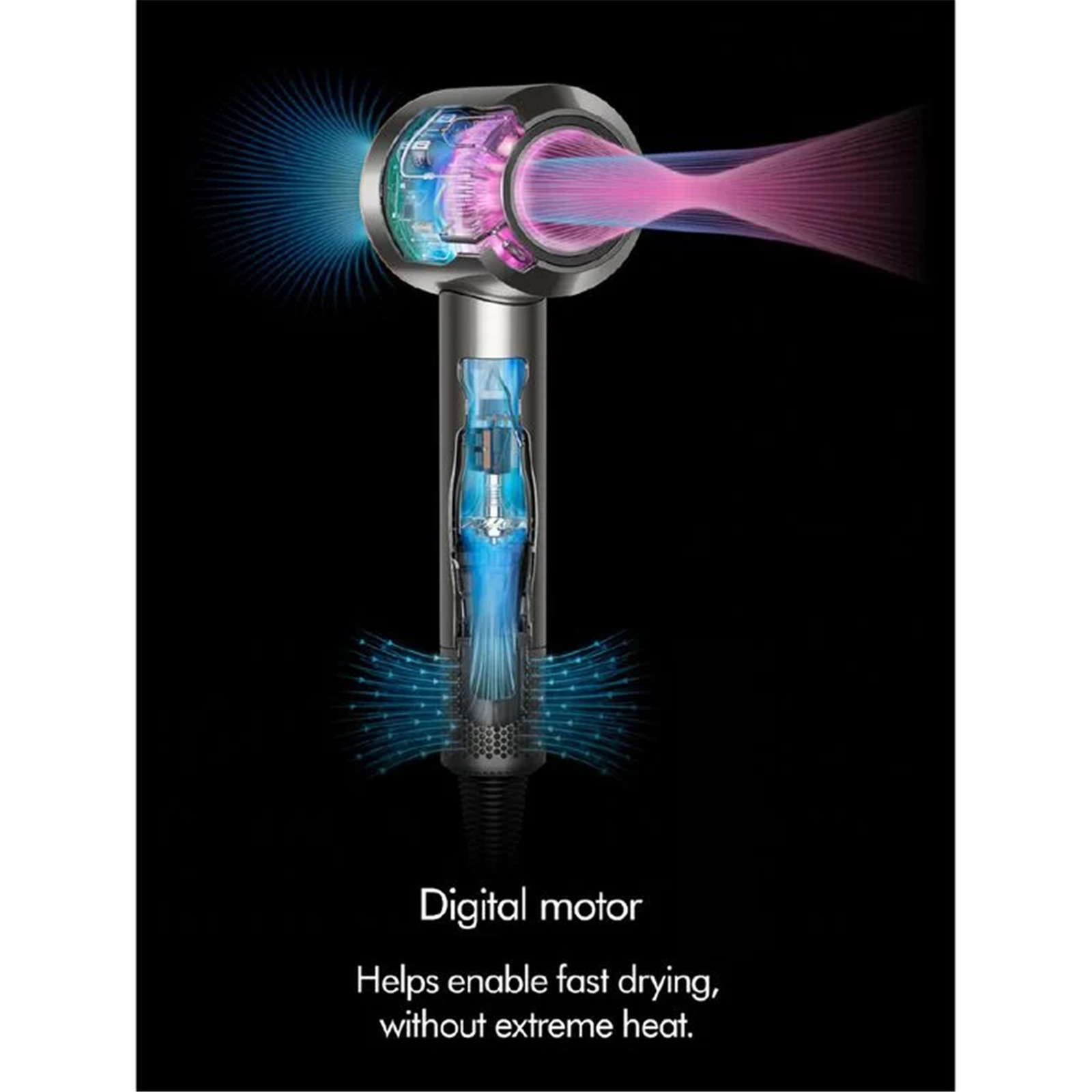 The small, powerful digital motor spins at up to 110,000rpm. Producing a high pressure, high-velocity jet of air, for fast drying without extreme heat.