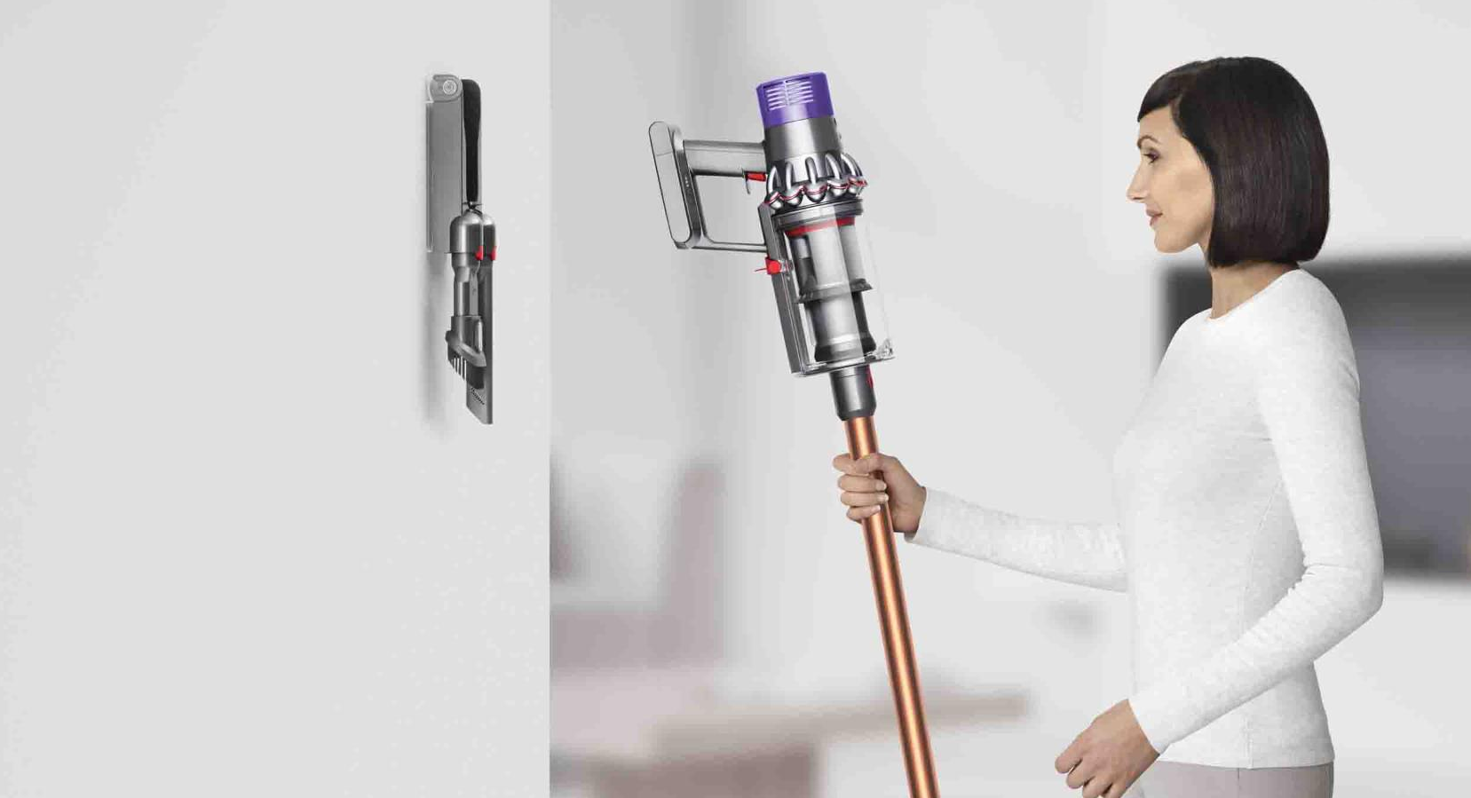 The Dyson Cyclone V10™ vacuum drops into the wall-mounted dock, to recharge it and tidily store tools. So it's ready to grab and go.