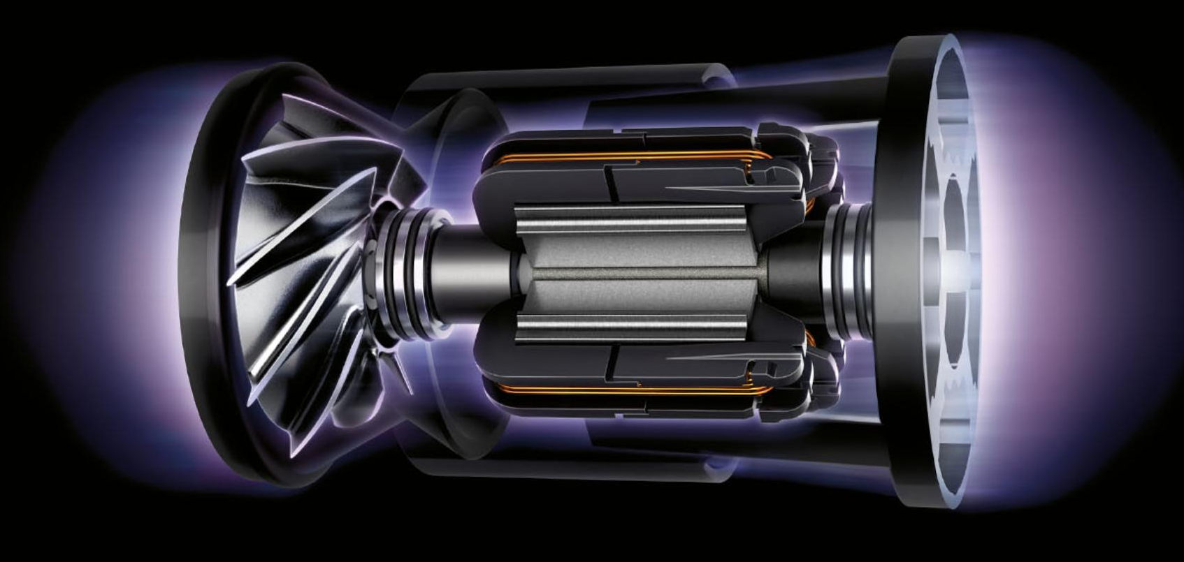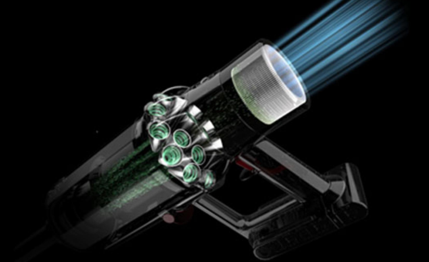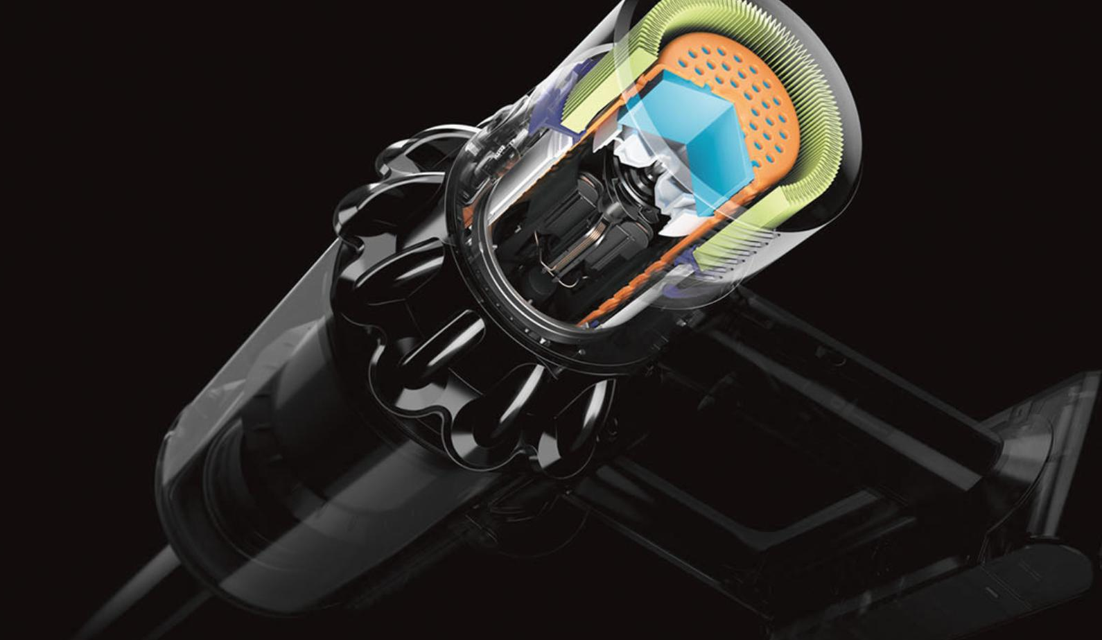 The motor, bin and cyclone are aligned, so air is drawn into the cyclones in a straight line - creating 30% more suction power than the Dyson V8™ vacuum cleaner.