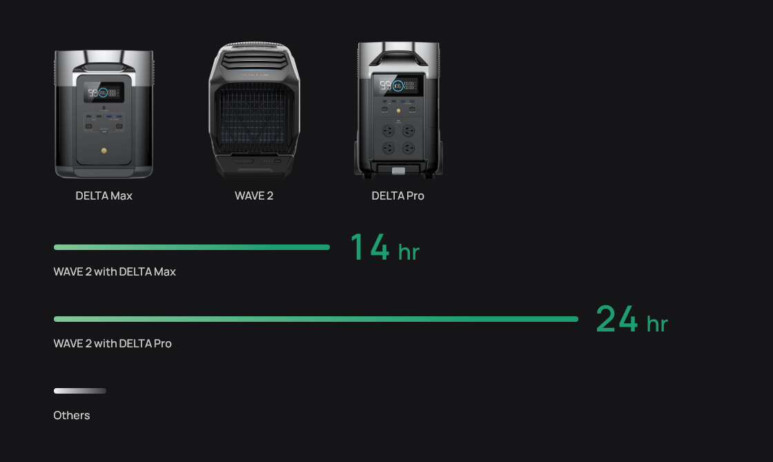 WAVE 2 is just the start. Pair with an EcoFlow DELTA 2 / DELTA Max or their extra batteries and get an astonishing 7-14hr run time in Eco Mode. Compared to using other portable power stations, it's 28% more efficient. You can also use any portable power station with a 820W input to charge your WAVE 2.