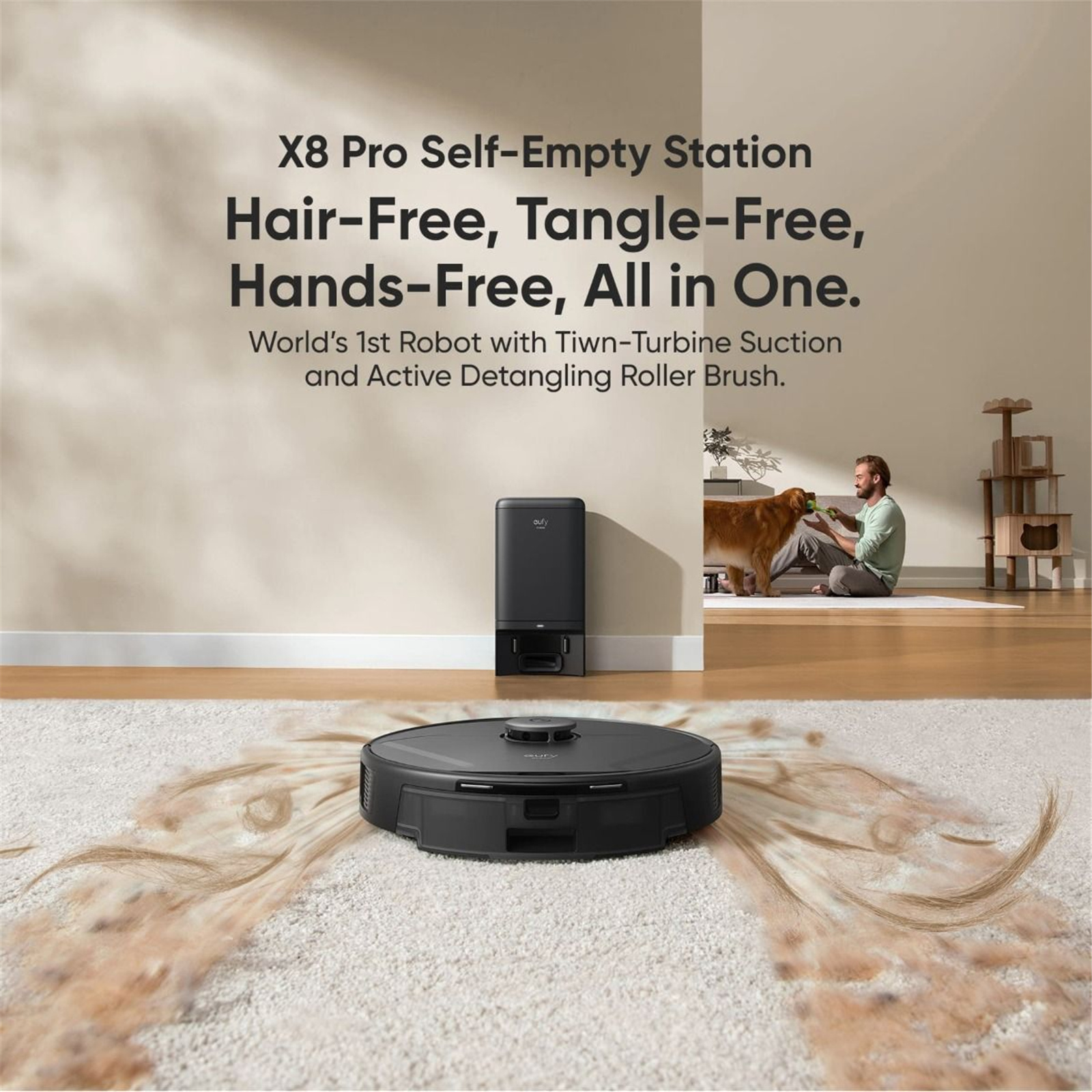 eufy Clean X8 Pro Robotic Vacuum Self-Empty Station, Twin-Turbine™ 2x 4,000 Pa Powerful Suction, Active Detangling Roller Brush, and iPath™ Laser Navigation for Pet Hair Deep Cleaning on Carpet