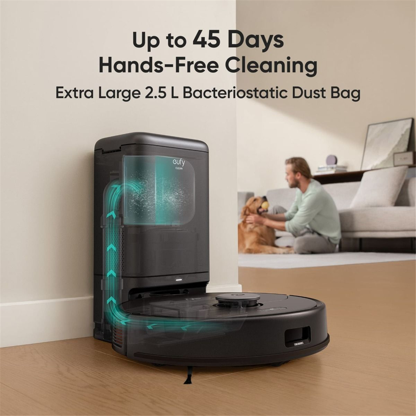 The Self-Empty Station has a 2.5L bacteriostatic dust bag that seals pet hair and debris. *According to data from eufy laboratories.