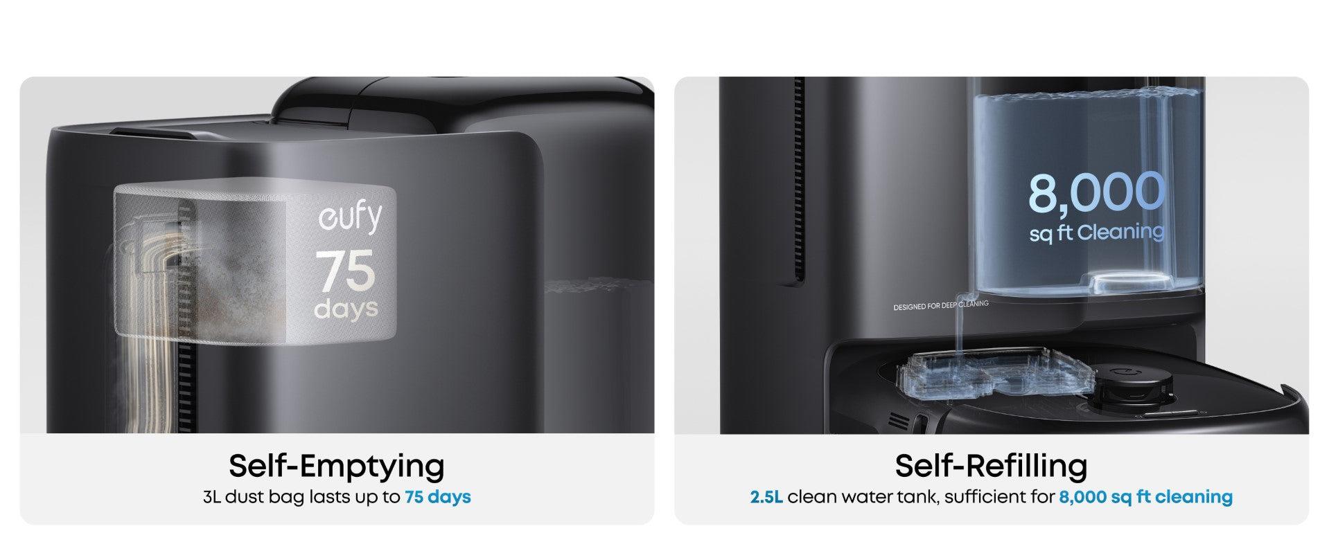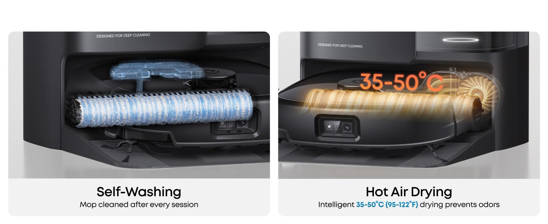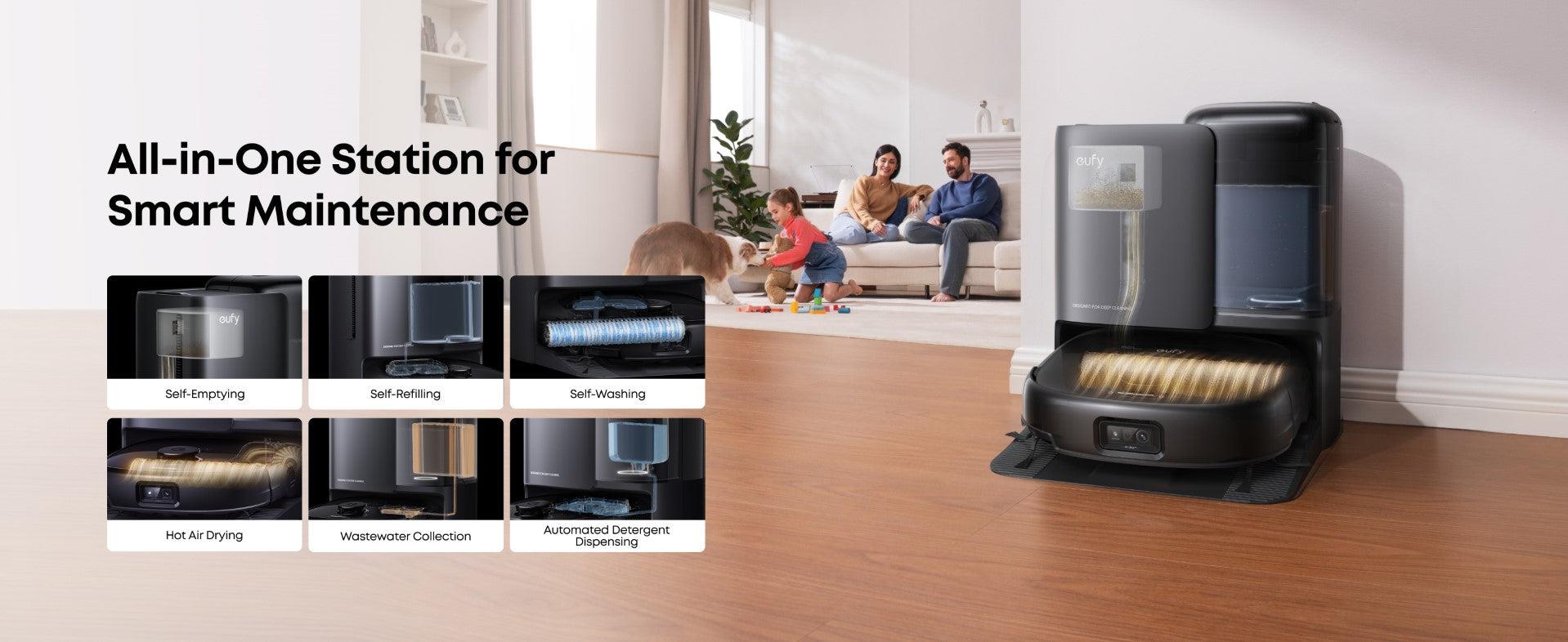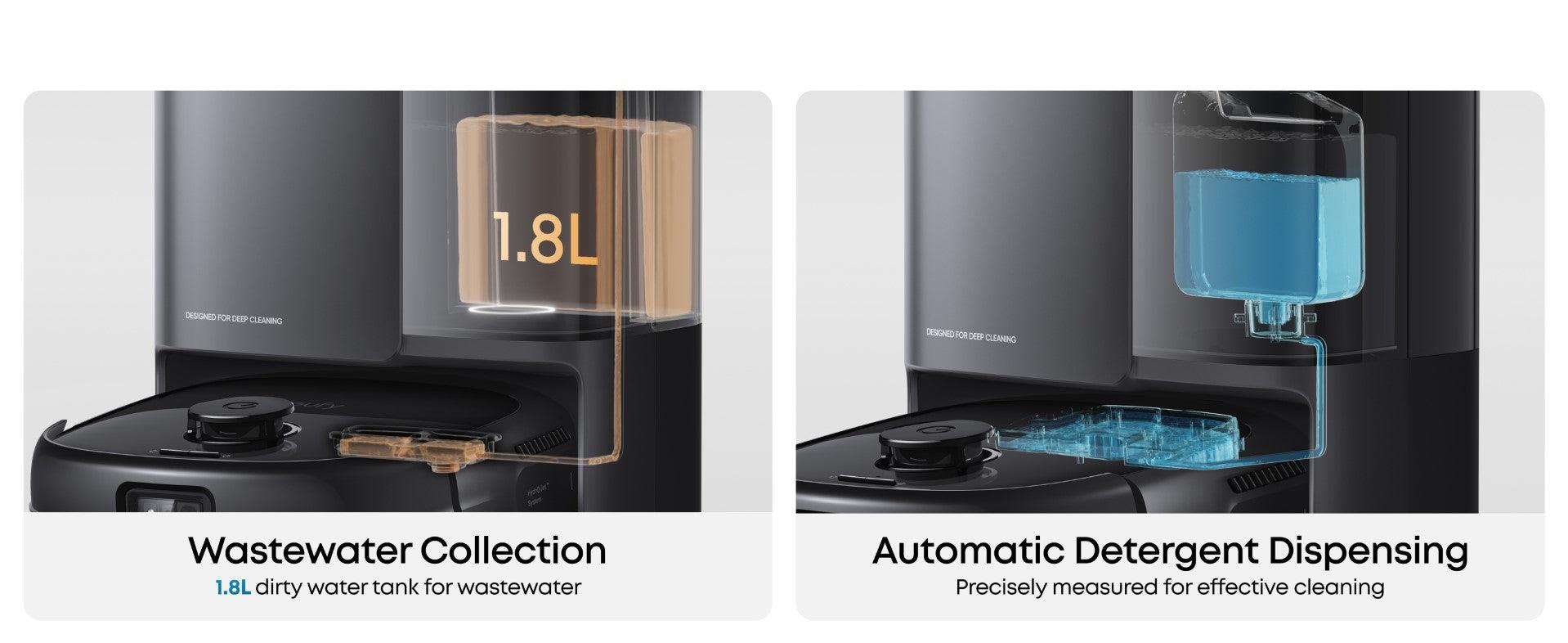 All-in-One Station for Total Convenience: Enjoy a truly hands-free cleaning experience with advanced features including self-emptying, self-washing, hot air drying, automatic detergent dispensing, wastewater collection, and self-refilling.