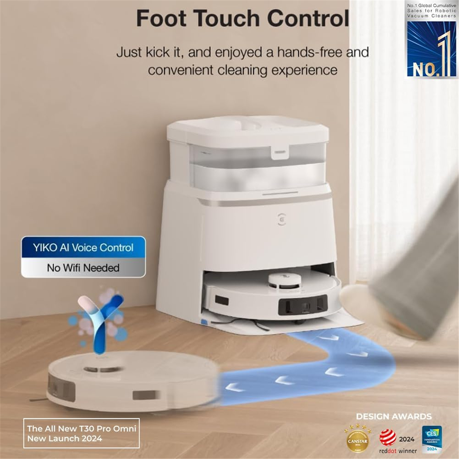 EcoVacs DEEBOT OZMO T30 Pro Omni Smart Floor Vacuum Cleaner - White TrueEdge Mopping 2.0 System - 70 C Hot Water Mop Wash with Massive 11000Pa Suction Power - YIKO AI Voice Assistant