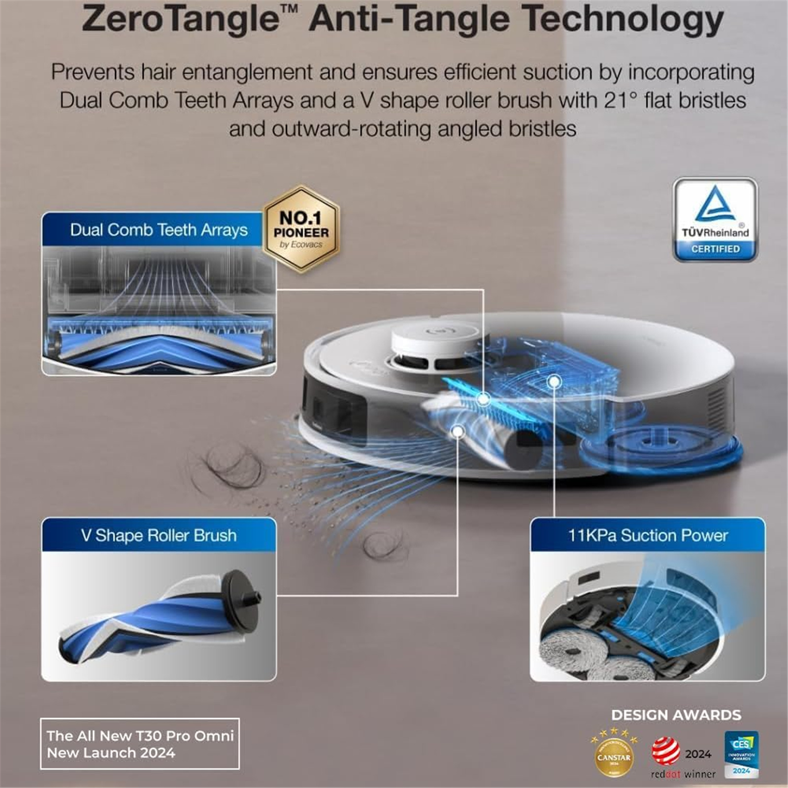 DEEBOT T30 Family prevents hair entanglement and ensures efficient suction by incorporating Dual Comb Teeth Arrays for flow-guide and a newly designed anti-tangling roller brush employs a structure with 21° flat bristles and outward-rotating angled bristles, providing users with a hassle-free cleaning experience and minimal maintenance, with a tangling rate as low as 0%.