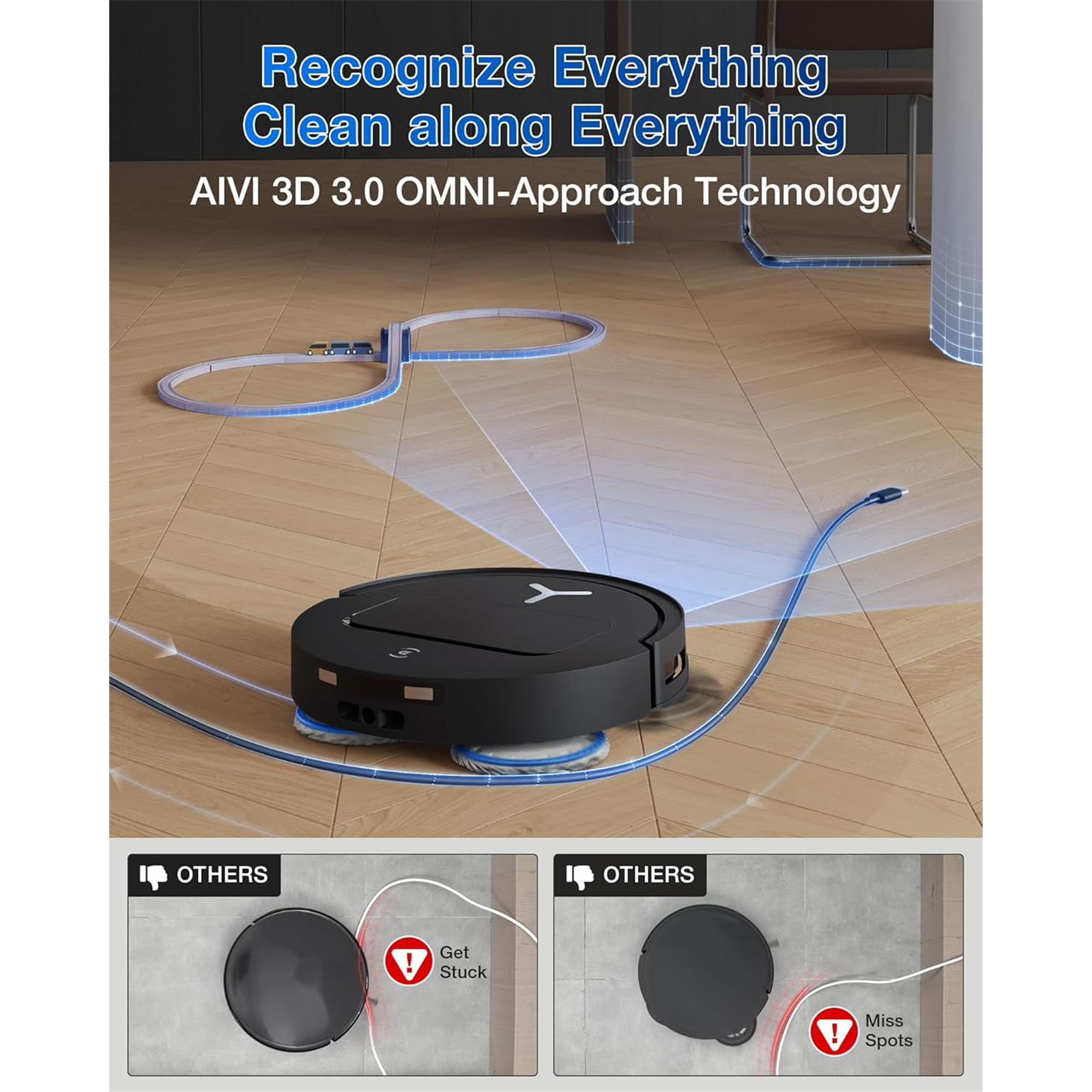 The DEEBOT T50 Family utilizes AIVI 3D 3.0 OMNI-Approach Technology, powered by the Vision-Language Model (VLM). This advanced technology allows the robot to recognize and identify all obstacles in real-time and use their contours as boundaries for edge cleaning. The visual and structured light modules work together to ensure continuous monitoring of the identified boundaries, allowing the T50 to clean tightly along obstacles without needing to avoid them, maximizing coverage and cleaning precision. This revolutionary approach overcomes industry challenges by providing seamless obstacle recognition and edge cleaning, delivering a spotless home without interruptions.