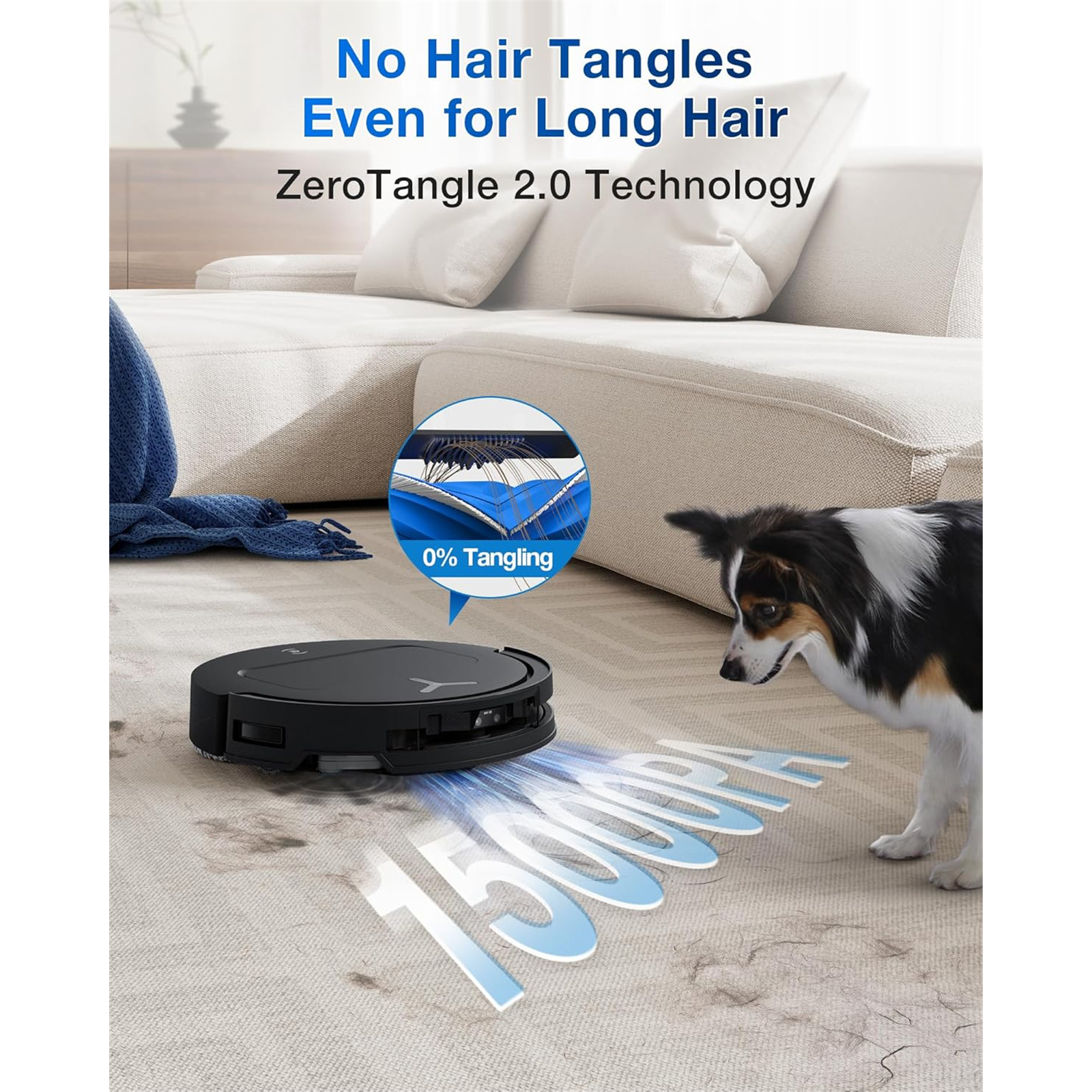 The DEEBOT T50 Family features ZeroTangle 2.0 with triple V-shaped Structure, which uses a 45° V-shaped anti-tangle bristle design to lift hair away, a V-shaped spiral brush to gather hair centrally, and V-shaped comb array teeth to dynamically untangle hair. The combination minimizes the rate of tangling up to 0%, makes maintenance a breeze and ensures optimal performance with every clean.