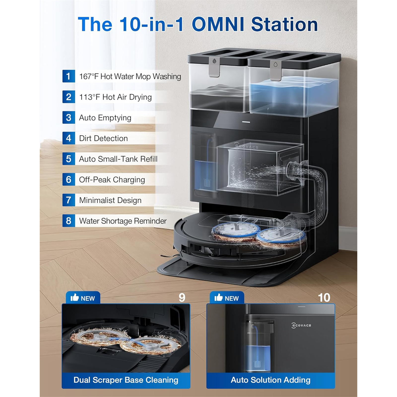 The upgraded all-in-one OMNI Station delivers unmatched convenience and cleaning automation. It features Auto-Empty, Hot Air Drying at 45°C, Automatic Detergent Refill, and Intelligent Off-Peak Charging. Equipped with dual-directional scrapers and 70°C Hot Water Mop-Washing, it automatically cleans both the mop and the base with Automatic Self-Cleaning, ensuring hassle-free maintenance and continuously deep cleaning without manual effort.