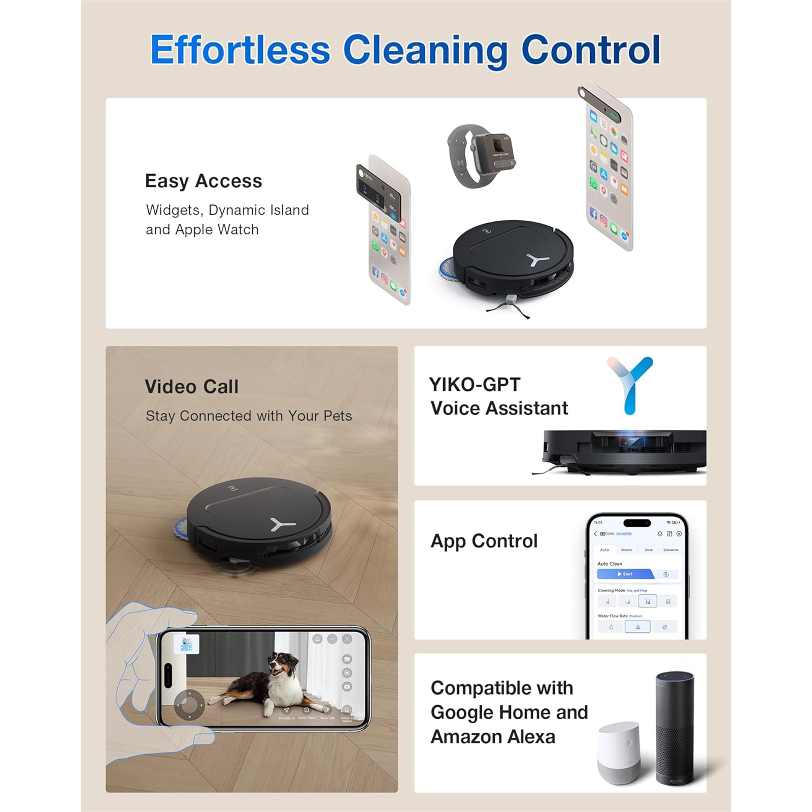 ECOVACS introduces YIKO-GPT AI Voice Assistant, a groundbreaking advancement that merges intuitive technology with your everyday cleaning routine. Control your DEEBOT with ease using three simple methods: sending voice message or text your desired cleaning mode via ECOVACS Home App, and using convenient hands-free voice commands. YIKO-GPT understands natural language commands to deliver a customized clean. This means users do not need to overthink commands and simply tell the DEEBOT to do tasks. The DEEBOT T50 Family also works with Google Assistant and Alexa, making smart home integration even more convenient.