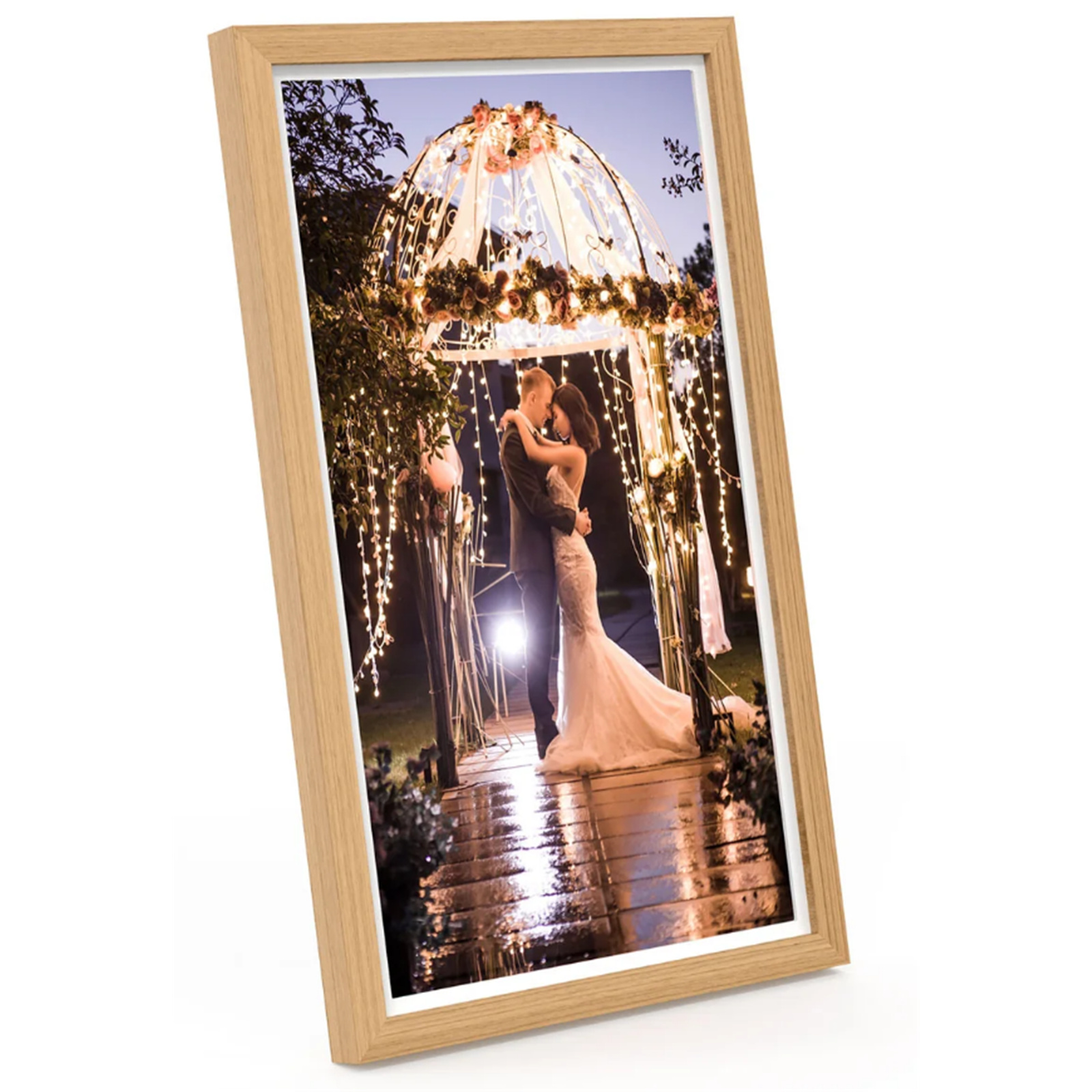 The WiFi Digital Photo Frame rotates in landscape or portrait mode depending on your picture's original orientation. You can stand the frame up via its desktop stand or mount it onto a wall using the mounting holes on its rear.
