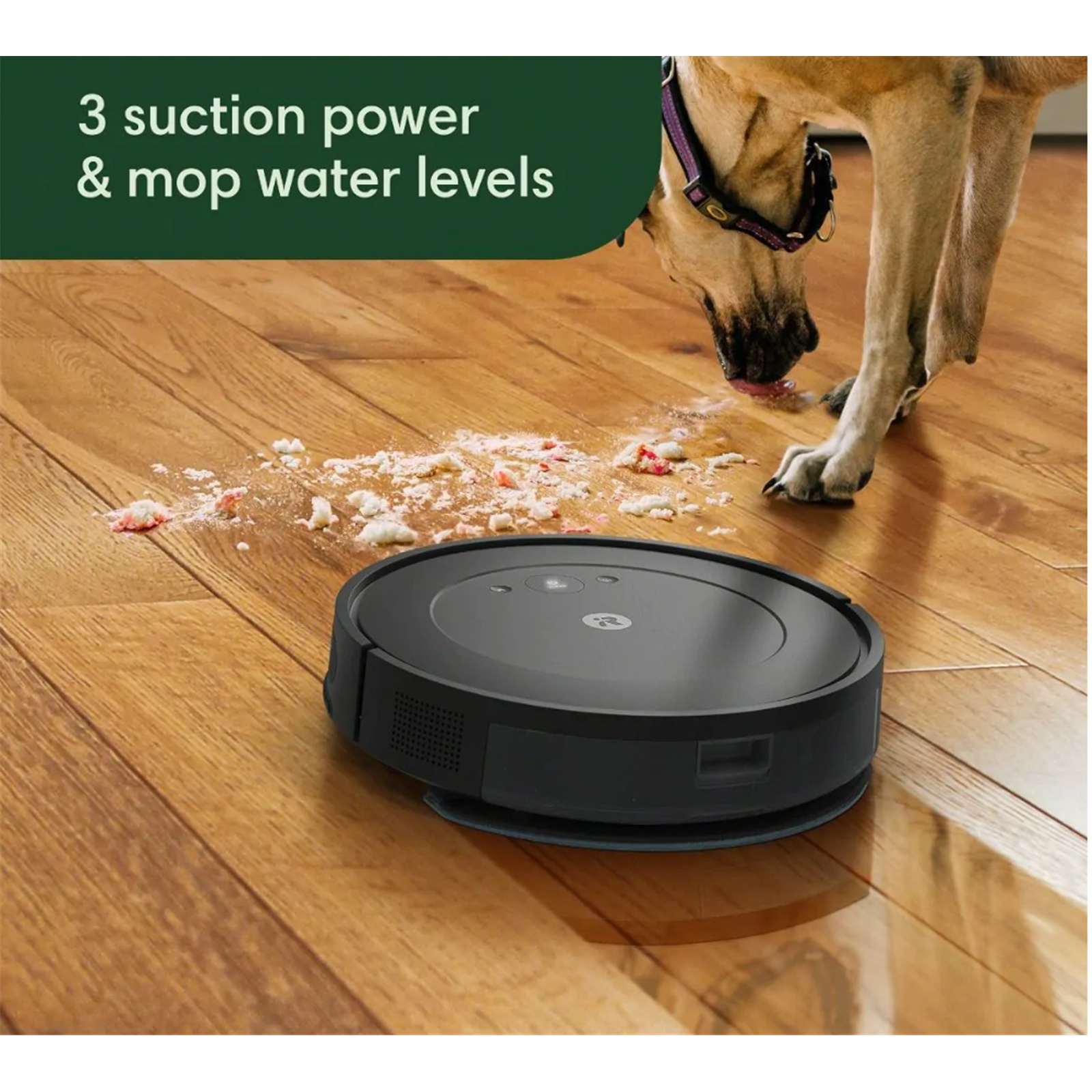 Dirt and dust disappear thanks to our built-in mop that effectively cleans up to 46m2 with a special textured, reusable microfiber pad and 3 options for mopping water levels.