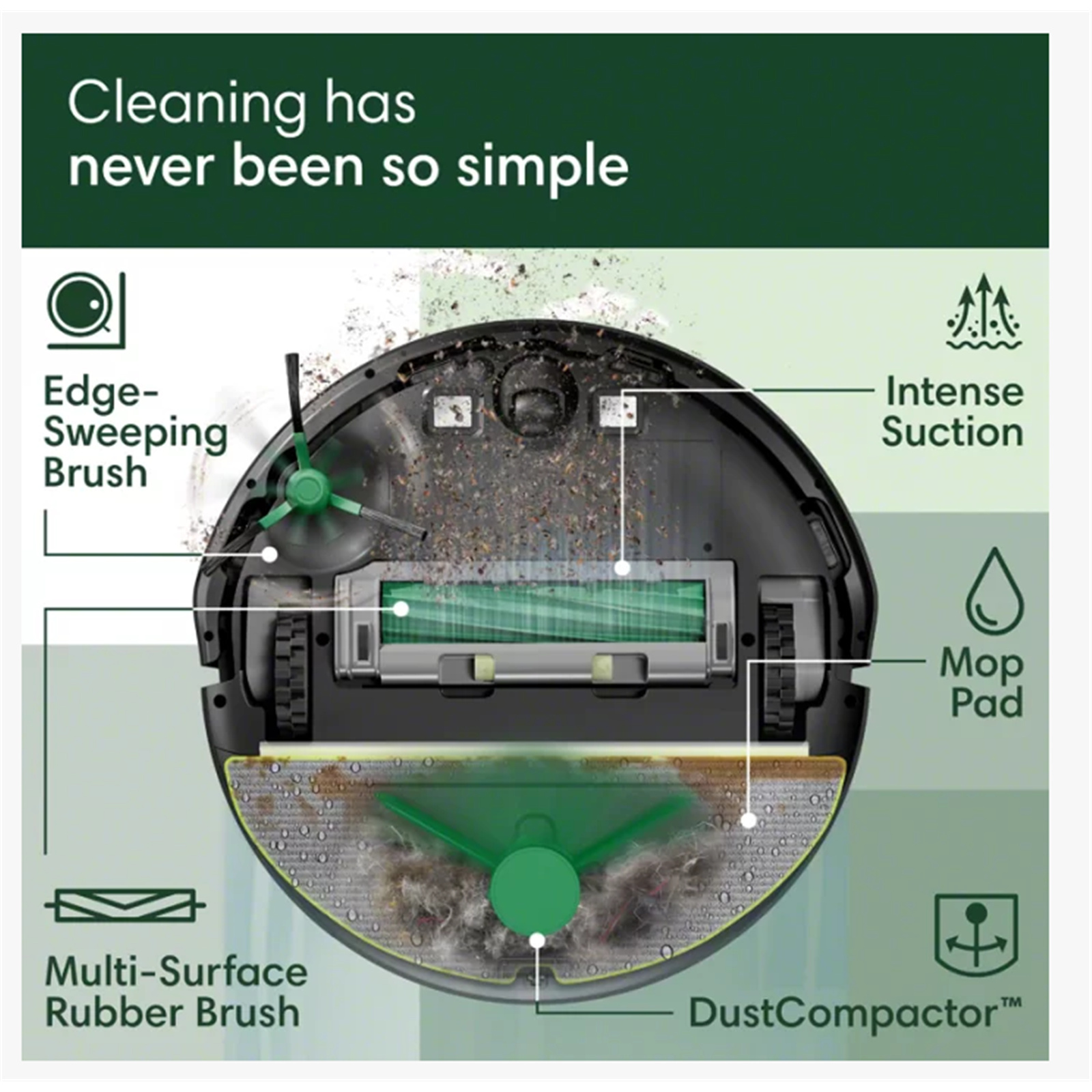 Only from Roomba®, the 205 DustCompactor™ Combo Robot features industry-leading innovation inside. Debris is suctioned up, continuously compacted, and contained inside the robot for up to 60 days at a time. Floors are barefoot-ready with 7000 Pa power-lifting suction and 2x deeper scrubbing* using a re-usable, washable microfiber mop pad.