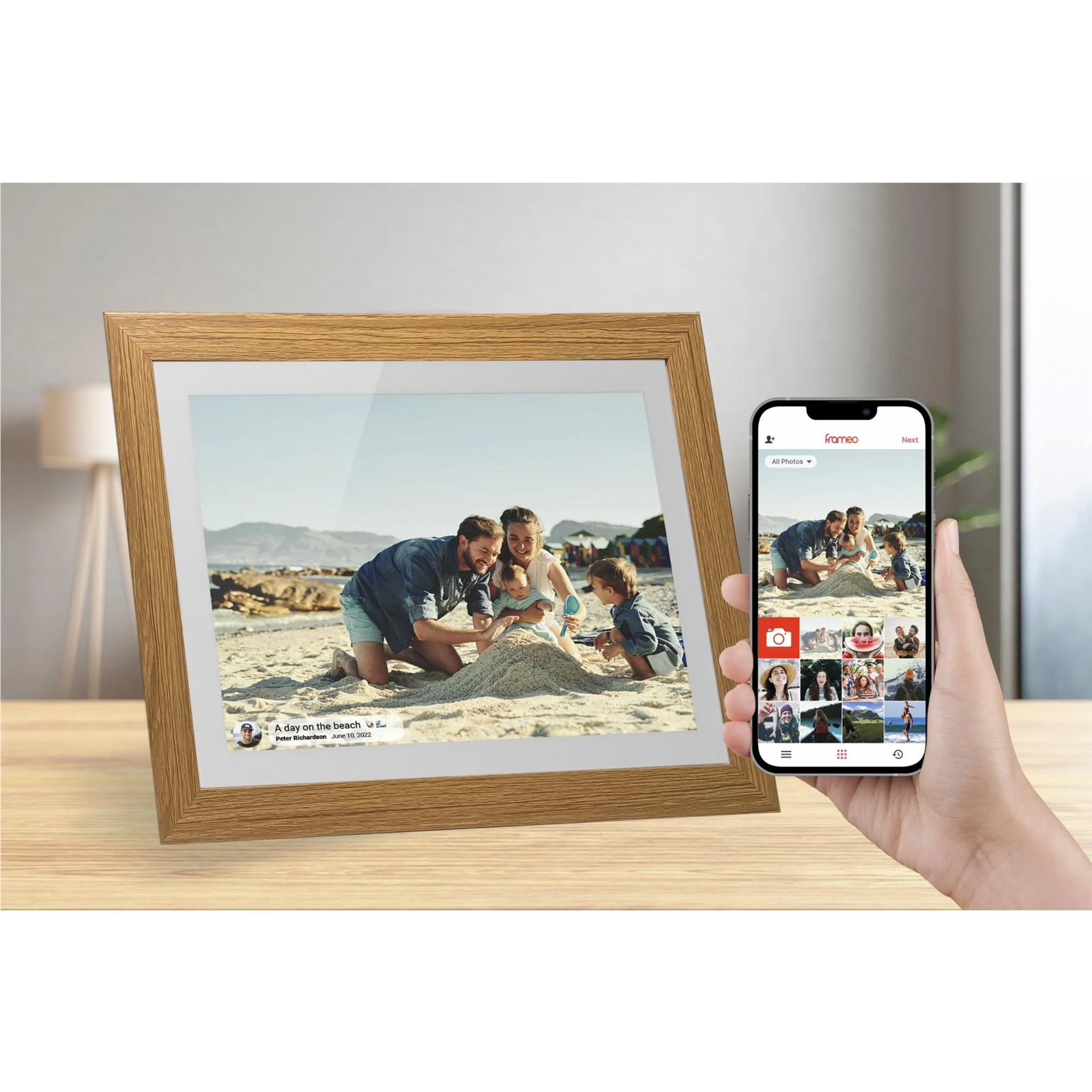 Jackson Frameo 10.1" WiFi Digital Photo Frame - White with Oak Frame 16GB Built in Memory - Play Video & Pictures - Touch Panel - Smart Frameo App Support - Android & IOS Support - 2.4Ghz