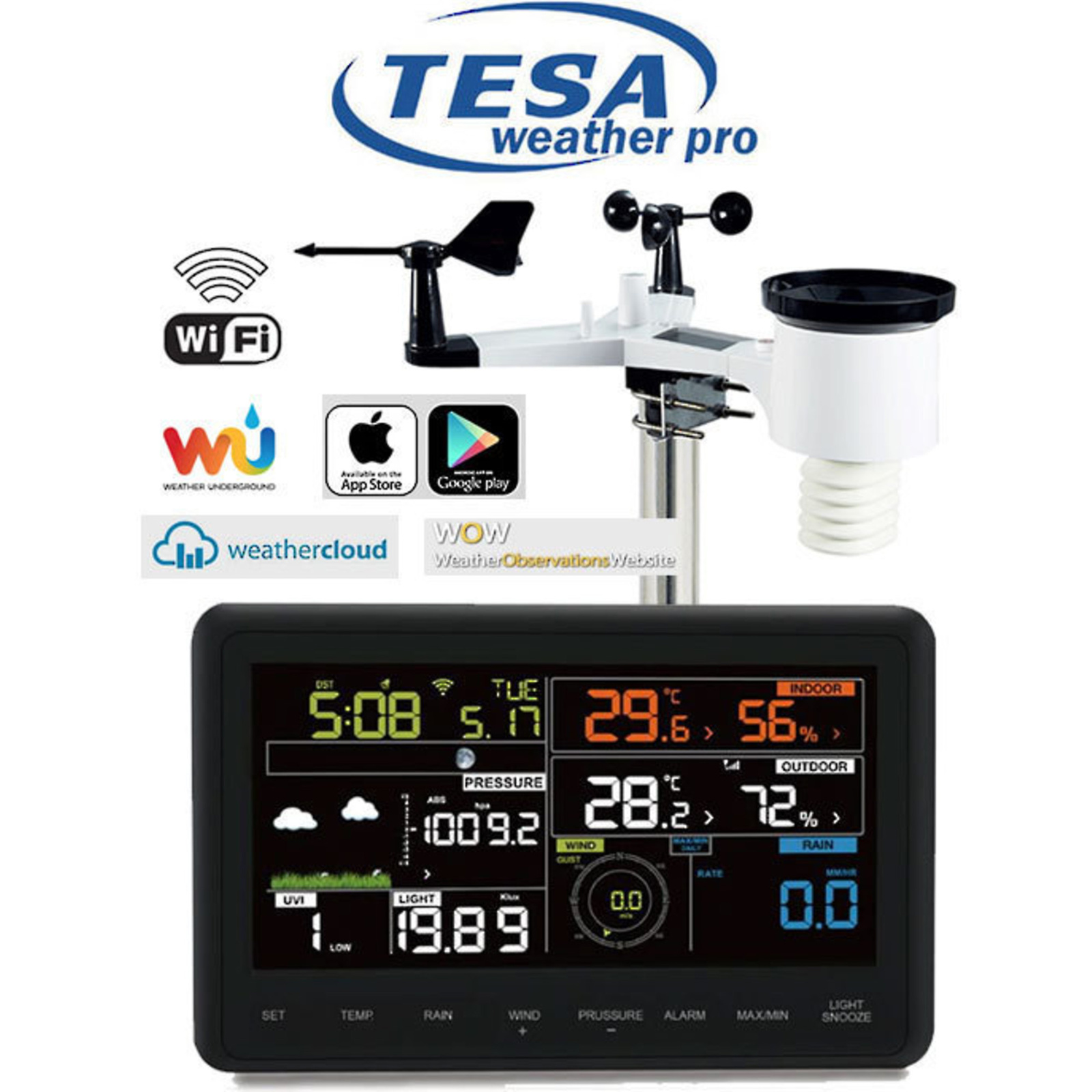 TESA newest professional WIFI weather station allows you to monitor your home and backyard weather conditions with the brilliant, easy-to-read LCD colour display. The enhanced Wi-Fi connectable option that enables your station to transmit its data wirelessly to the world's largest personal weather station network, Weather Underground and view data on your mobile device.