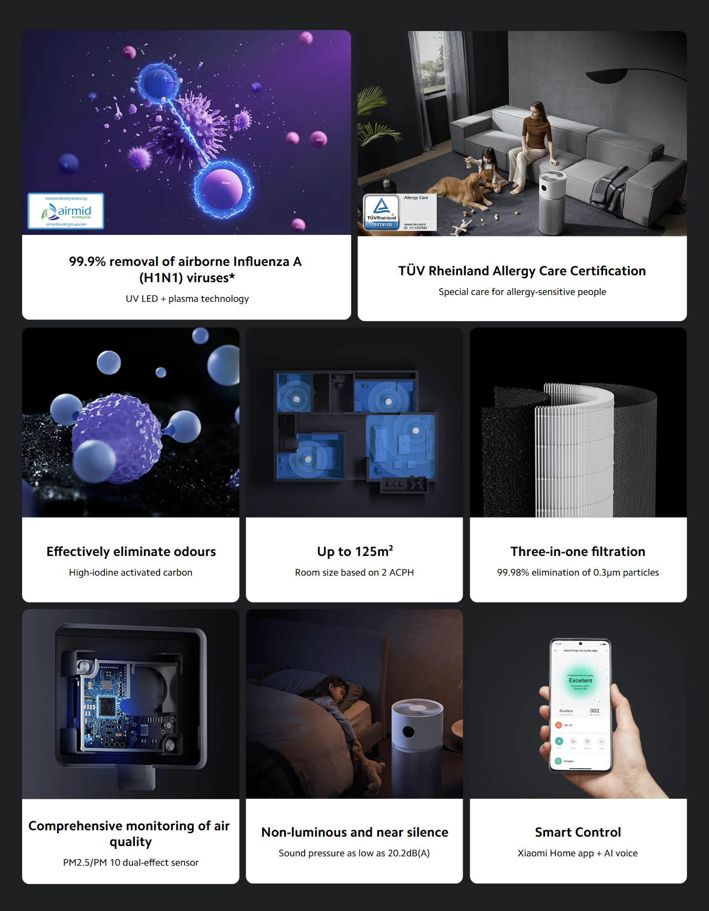 *99% removal rate of pollen allergens in 1 hour, 99% removal rate of dust mite allergens in 1 hour, 99% removal rate of pet dander allergens in 1 hour: Certified by TÜV Rheinland (China) Ltd. Report no.: CN22O9EW001.