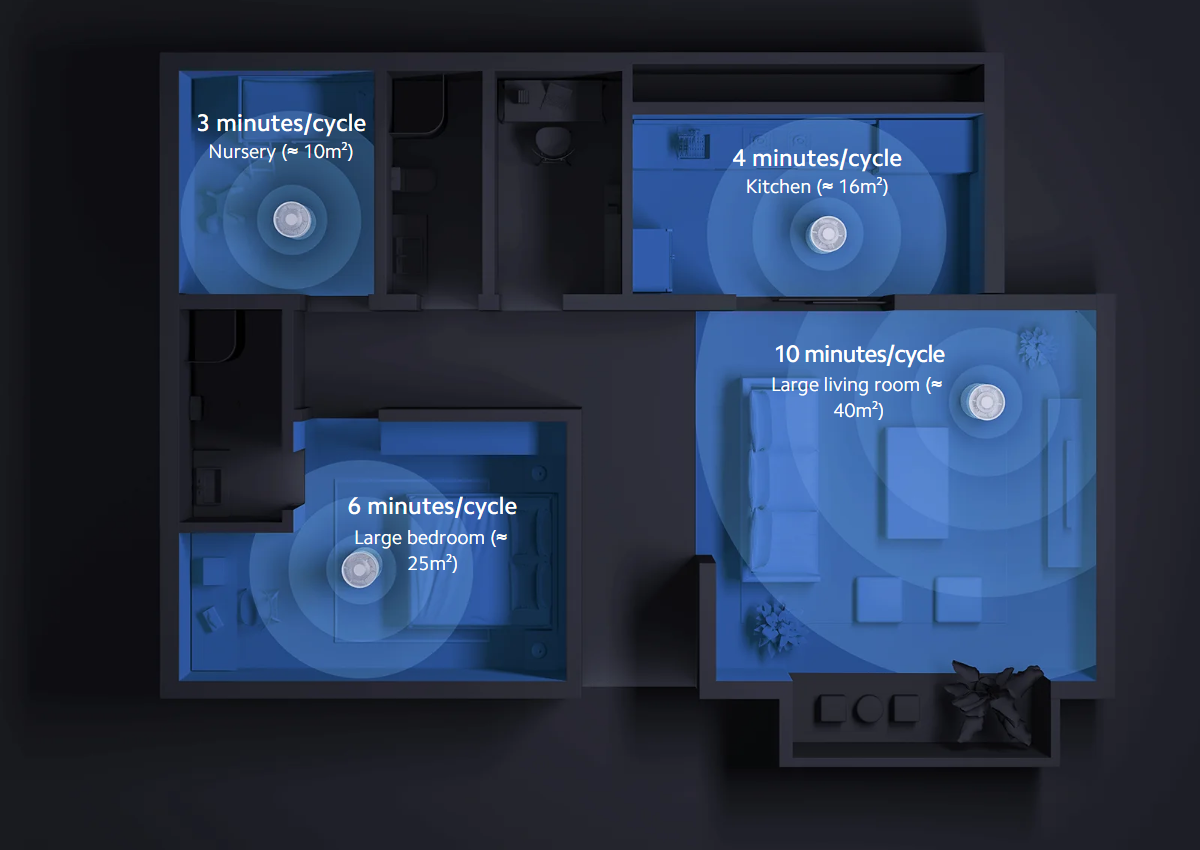 *Assuming rooms have a ceiling height of 2.4m. For different rooms, the approximate time required for purifying a room is calculated by: Room size x 2.4m ÷ particle CADR x 60mins.