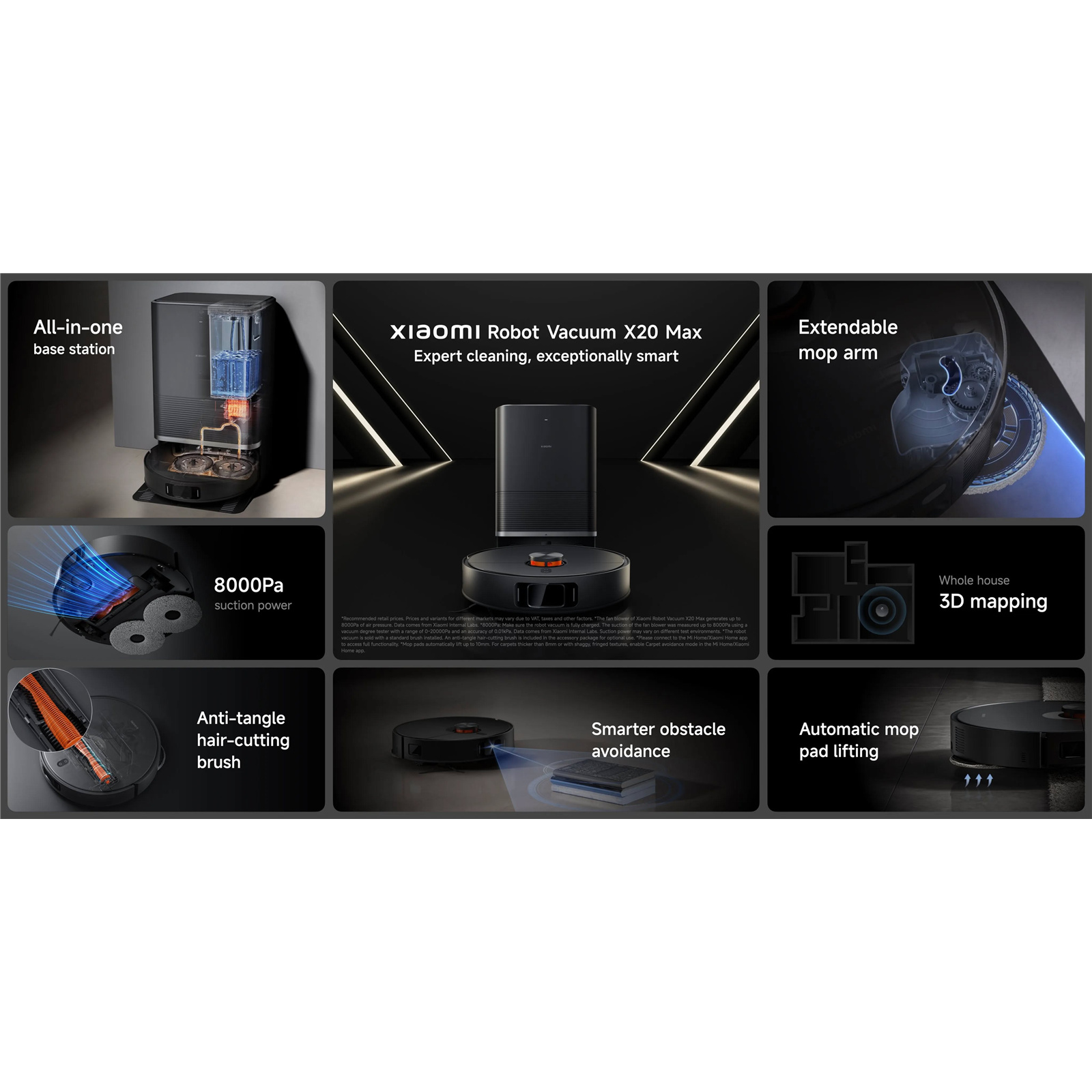 Xiaomi X20 Max Smart Vacuum & Mopping Robot Cleaner & Auto Fill Empty Station Edge CleanArm - 8000 Pa Suction Power - 55°C Auto Mop Pad Washing - Hot Air Drying - Anti-Tangle Hair-Cutting Tech