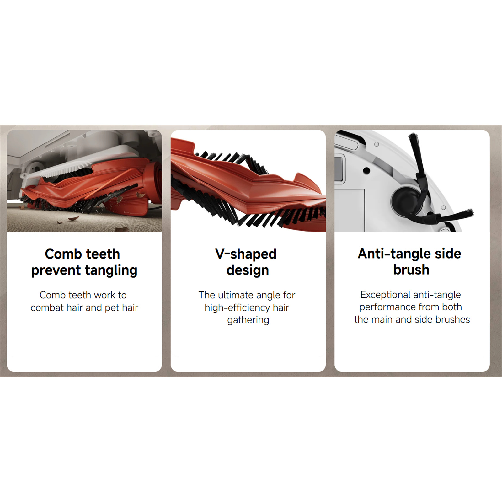 With a comb-like structure paired with a golden V-shaped main brush, the side and main brushes work in harmony to effectively prevent tangling. Whether it's long hair, short hair, or pet hair, everything is seamlessly sucked into the dustbin.