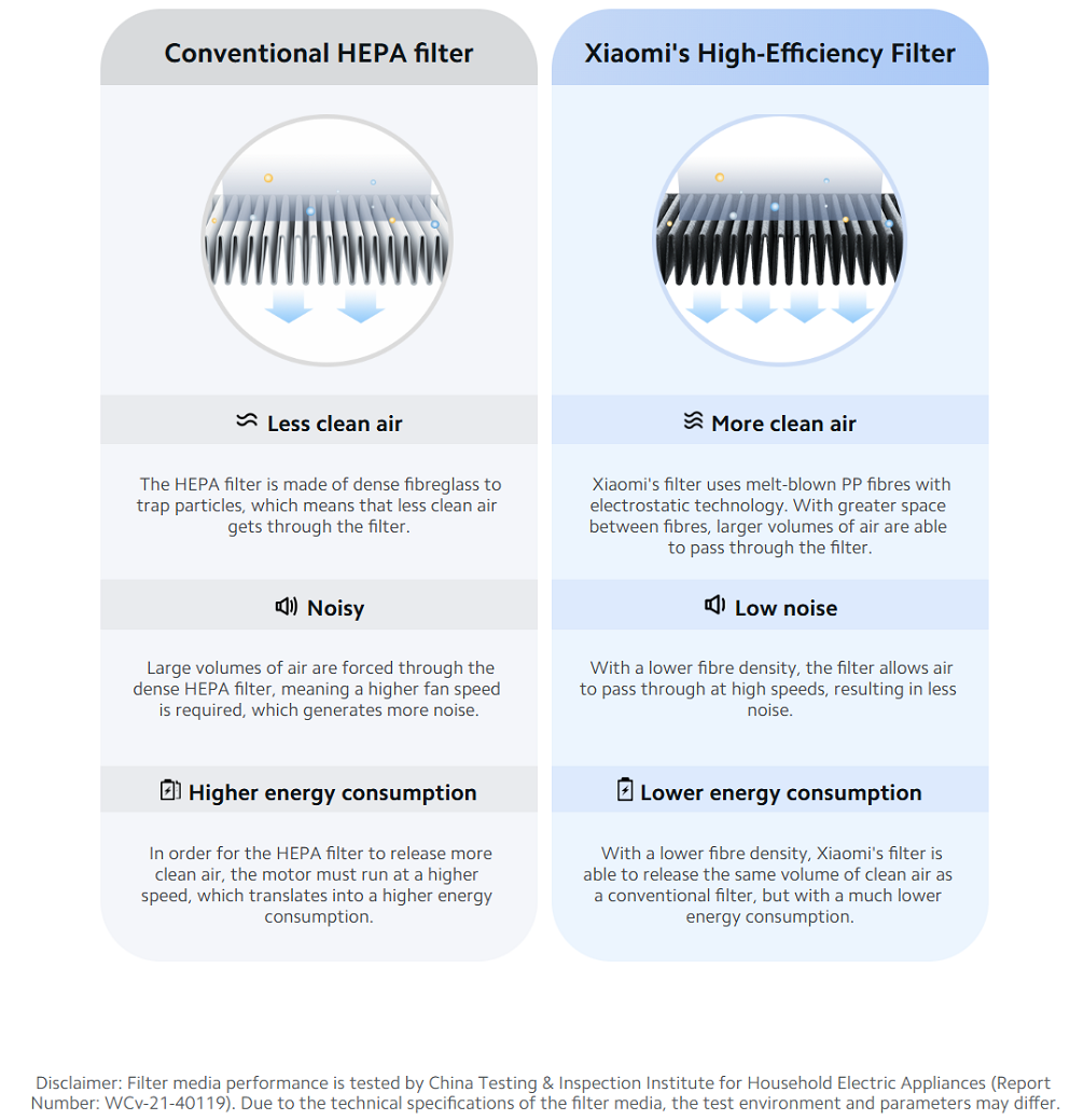 Compared to a conventional HEPA filter, Xiaomi's High Efficiency Filter allows the air purifier to generate less noise and consume less energy by allowing more airflow to pass through the filter all the while keeping the same cleaning efficiency.