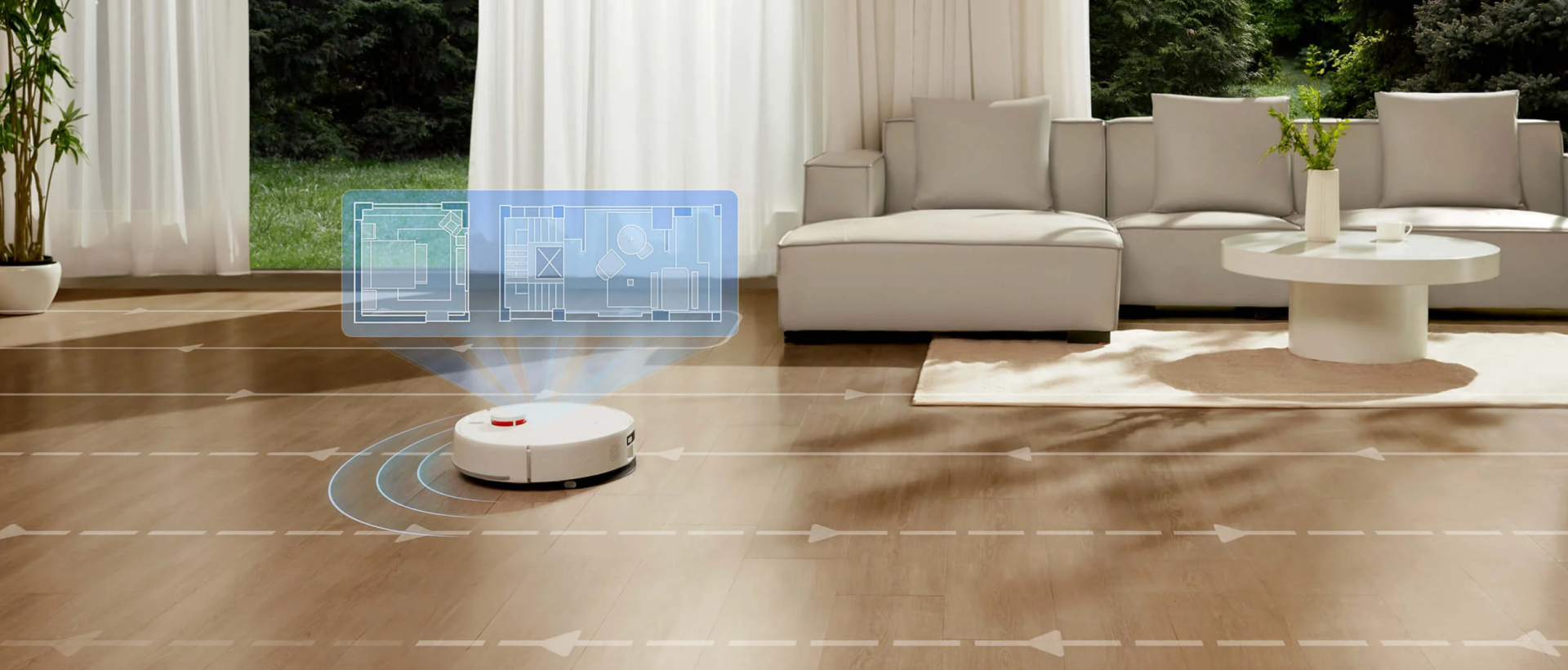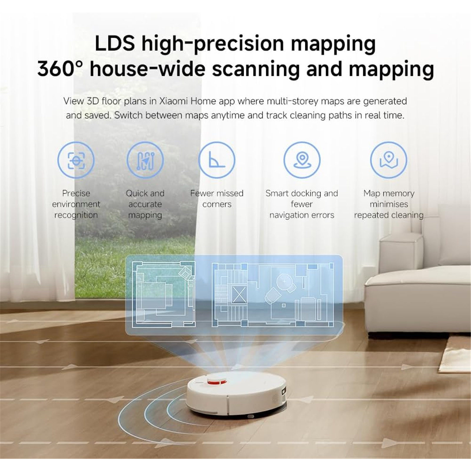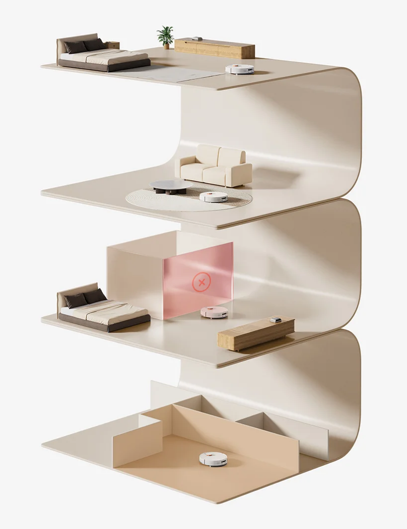 View 3D floor plans in Xiaomi Home app where multi-storey maps are generated and saved. Switch between maps anytime and track cleaning paths in real time.