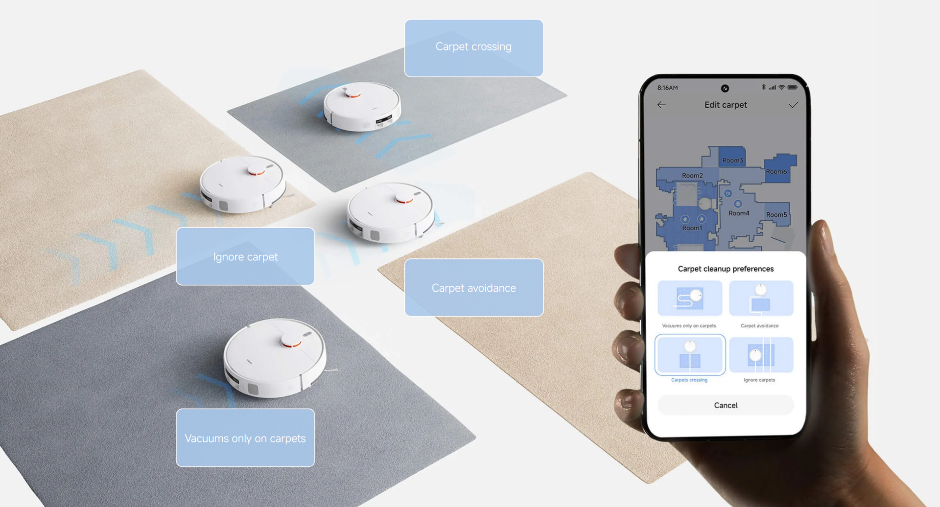 Thorough deep cleaning with two passes and strong suction for effective dust removal. Choose your cleaning preferences in the Xiaomi Home app, and tailor settings for each carpet for a worry-free clean.