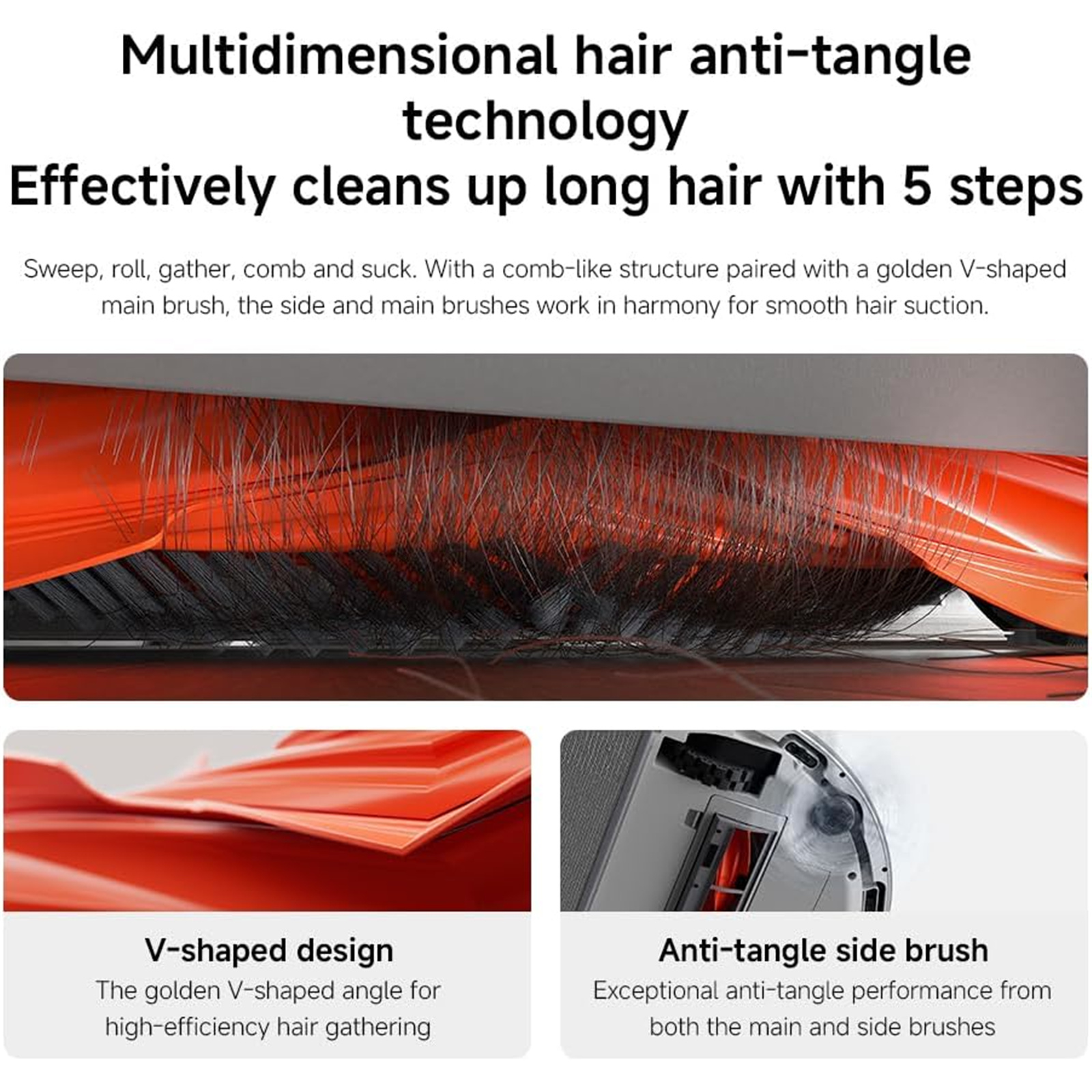 Sweep, roll, gather, comb and suck. With a comb-like structure paired with a golden V-shaped main brush, the side and main brushes work in harmony for smooth hair suction.