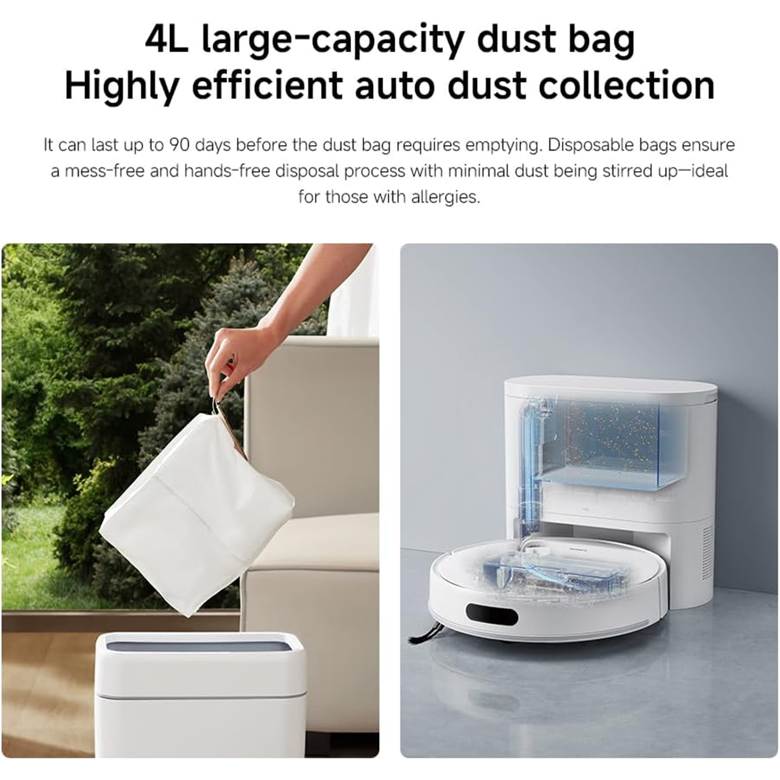 With its compact and sleek design, the base station integrates seamlessly into your home decoration while maintaining basic function like auto dust collection.