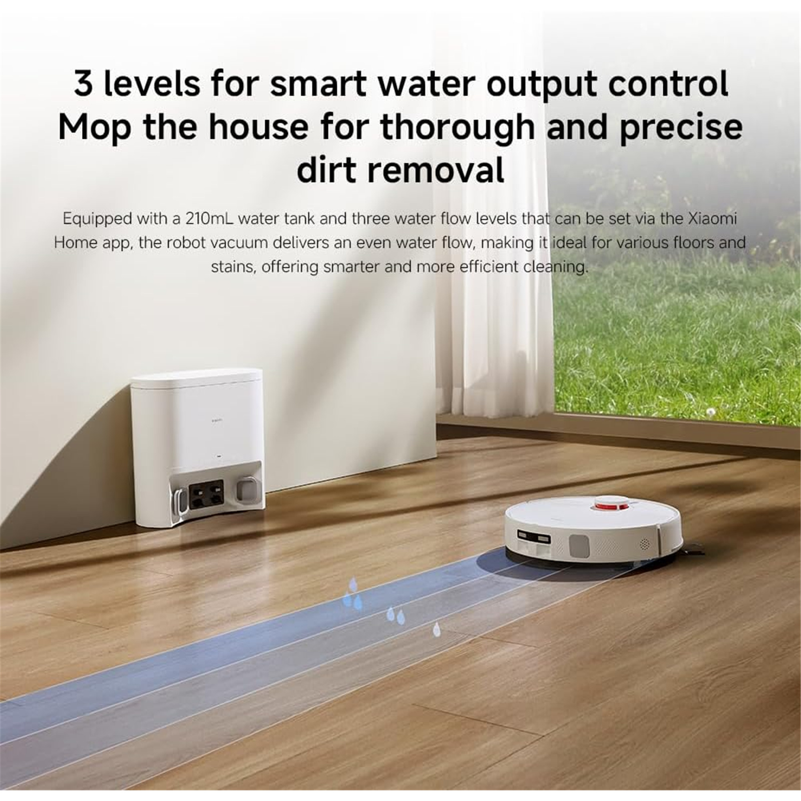 Equipped with a 210mL* water tank and three water flow levels that can be set via the Xiaomi Home app, the robot vacuum delivers an even water flow, making it ideal for various floors and stains, offering smarter and more efficient cleaning.