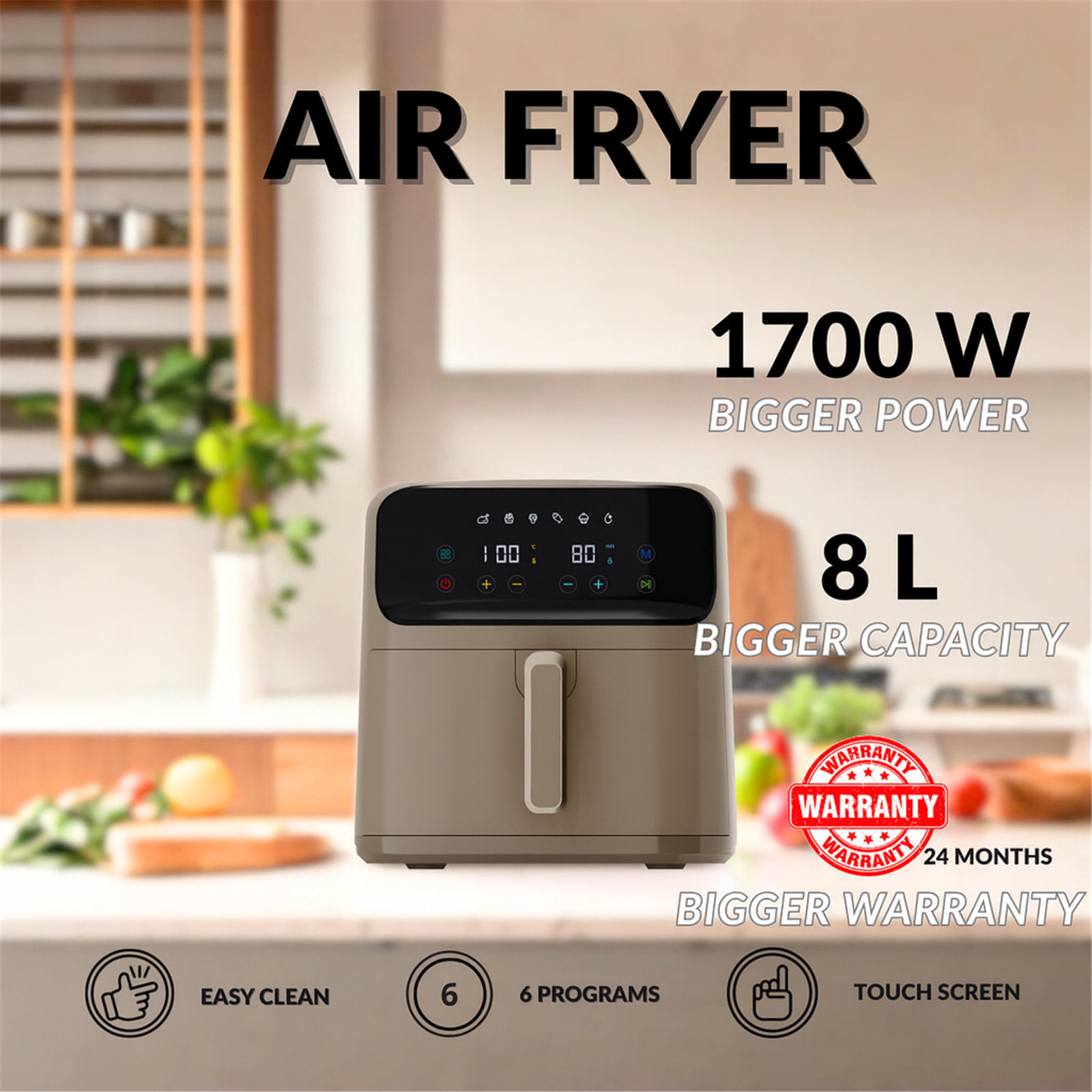 NoBrand 8L Air Fryer Single Tray - XXL Space - 1700W - 80-200° Digital Temperature Control - RealAir Technology - 2 Years Warranty